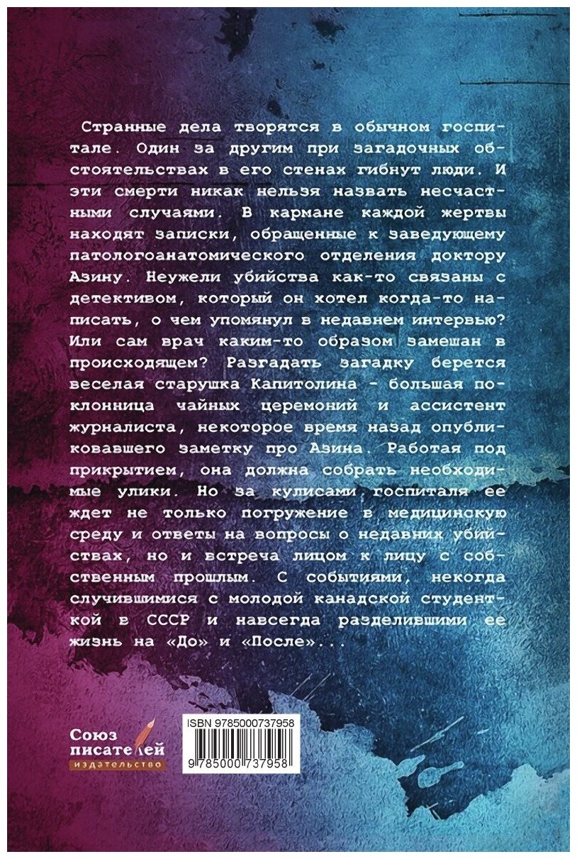 Прячется ли убийца среди людей в белых халатах? Возможно ли раскрыть тайну 40-летней давности? Ответы на вопросы вы найдете вместе с героиней – современной мисс Марпл – вездесущей старушкой, взявшей на себя расследование, за плечами которой не меньше захватывающих историй и холодящих душу тайн, чем в больнице, где одно за другим происходят убийства. Капитолина не только распутывает загадки, но и развлекает друзей и коллег своими многочисленными рассказами о чайных церемониях. Книга знакомит с особенностями профессии патологоанатома, погружает в загадочный мир медиков.