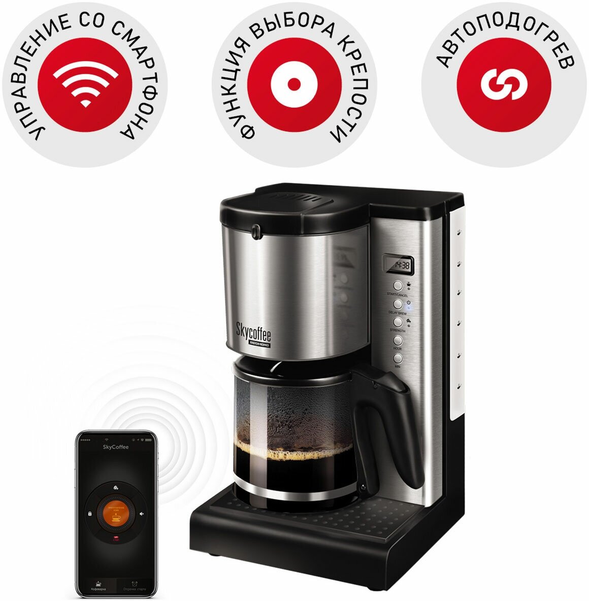 Кофеварка SkyCoffee M1509S со съёмным многоразовым фильтром может управляться дистанционно с телефона благодаря удобному и интуитивно понятному мобильному приложению Ready for Sky Home, а за счёт использования новейших энергосберегающих решений расход электроэнергии минимален. В мобильном приложении доступны такие возможности, как: старт приготовления кофе, включение подогрева готового напитка, отсрочка старта до 24 часов, выбор крепости кофе, отключение звуковых сигналов, активация защиты от детей («Безопасный режим») и, конечно, включение / выключение прибора.