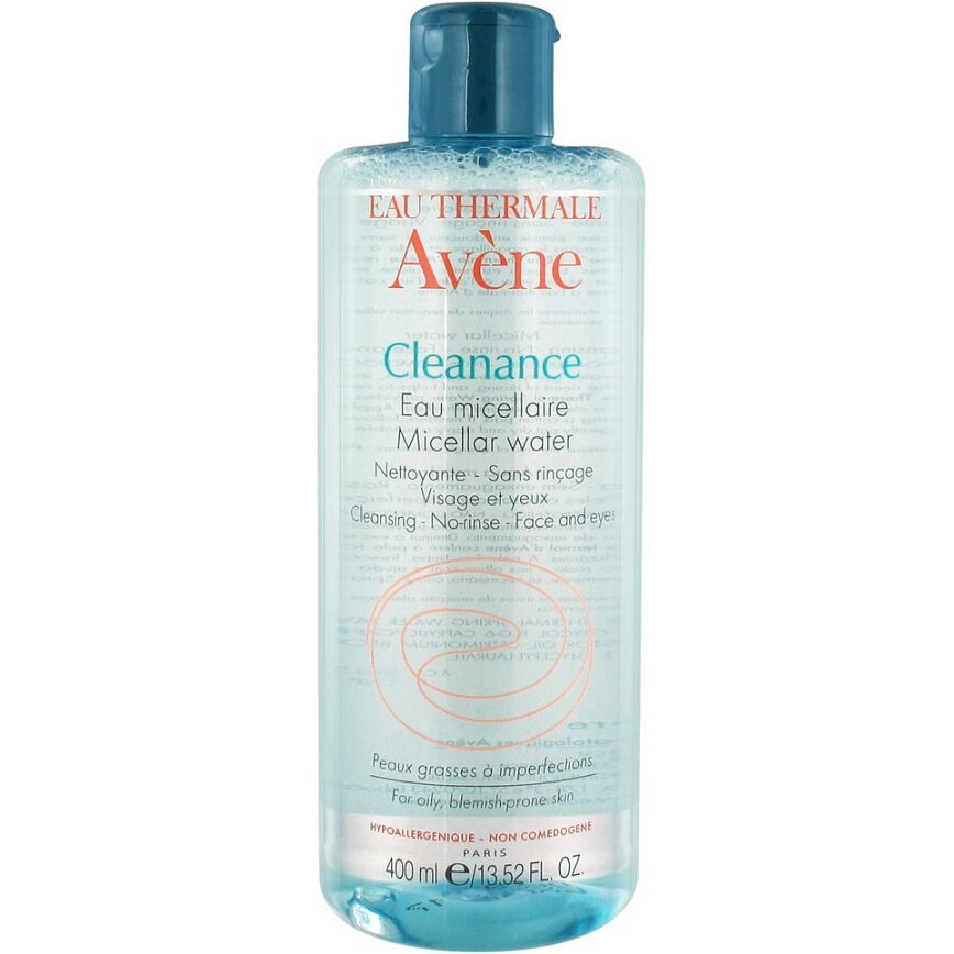 Avene Cleanance вода мицелл 400мл. Состав: Eau thermale d'Avène, excipients qsp 100 %, butylene glycol, pentylene glycol, PEG-6 caprylic/capric glycerides, PEG-40 hydrogenated castor oil, cetrimonium bromide, disodium EDTA, fragance, glyceryl laurate.