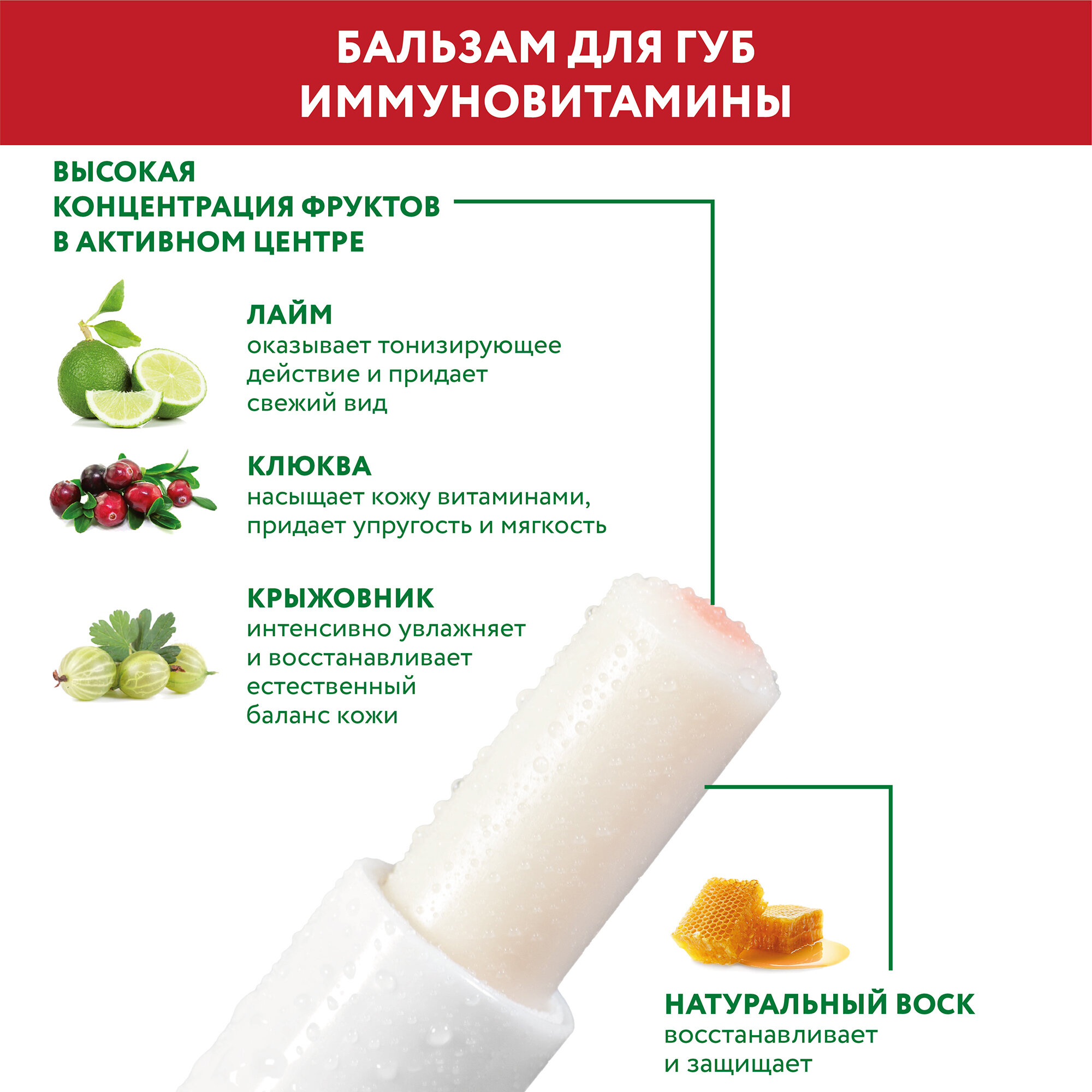 Это натуральное средство предназначено для восстановления губ и насыщения их питательными веществами. Три растительных компонента. находящиеся в сердцевине воскового стика. позволяют позаботиться о губах и подарить им нежный аромат. Входящий в состав средства экстракт лайма приводит губы в тонус. возвращает насыщенность цвета и свежесть. Другой компонент. экстракт клюквы. делает нежную кожу губ эластичной и мягкой. одновременно насыщая губы витаминами и повышая их естественную защиту. И. в дополнение. экстракт крыжовника глубоко увлажняет кожу. делая их гладкими и восстанавливая водный баланс. Натуральный воск. который позволяет заключенным в него природным экстрактам сохранять свои ценные качества продолжительное время. также приносит пользу губам: покрывая их защитным слоем. он придаёт им блеск и дарит защиту от негативных факторов – мороза. сухого и жаркого воздуха. ветра. прямого солнечного света. Бальзам не вызывает раздражений и чувства стянутости и может применяться ежедневно.