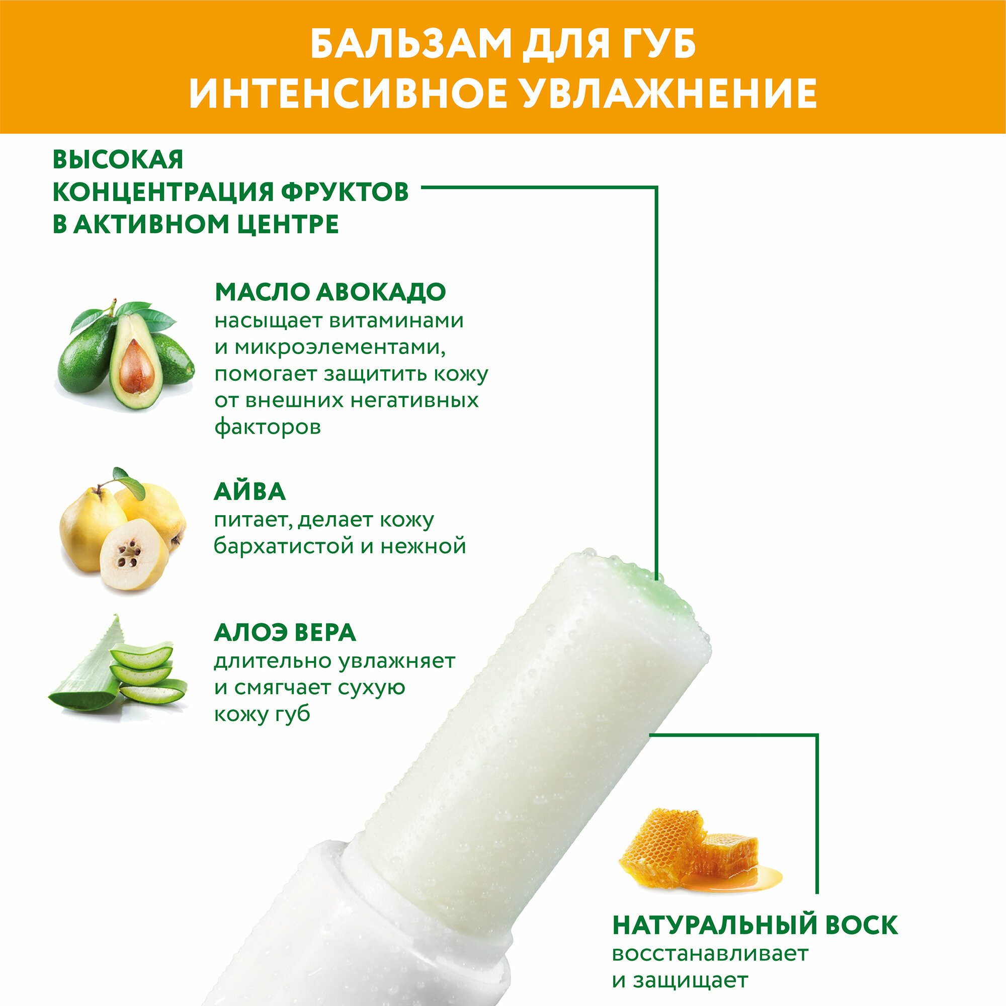 Смягчение и увлажнение нежной кожи губ. насыщение её витаминами и микроэлементами. возвращение прекрасного внешнего вида и защита – всё это призваны подарить Вам три активных природных компонента бальзама для губ. заключенные в защитную оболочку из воска. Присутствие экстракта айвы позволяет бальзаму вернуть мягкость и нежность. успокоить кожу и улучшить цвет губ. Целебный экстракт алоэ вера глубоко увлажняет губы и восстанавливает водный баланс. что позволяет губам вернуть упругость. гладкость и сочность. Масло авокадо не только отлично насыщает губы витаминами и микроэлементами. увлажняя и омолаживая кожу. но и защищает губы от стрессов. Отдельный полезный эффект оказывает воск. позволяющий трём компонентам сохранять свои свойства продолжительное время: он создаёт на губах защитный барьер. предохраняя их от неблагоприятных условий – ультрафиолета. ветра. мороза. жары. Фруктовый аромат. остающийся на губах после нанесения бальзама. поднимет Вам настроение даже в самый непогожий день.
