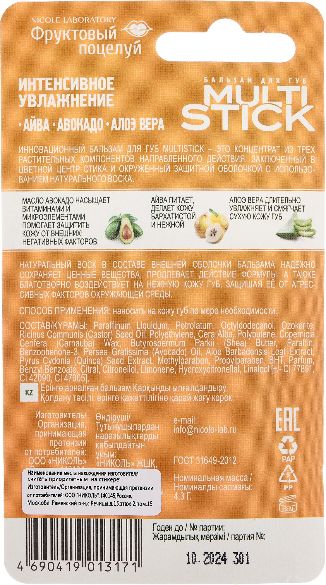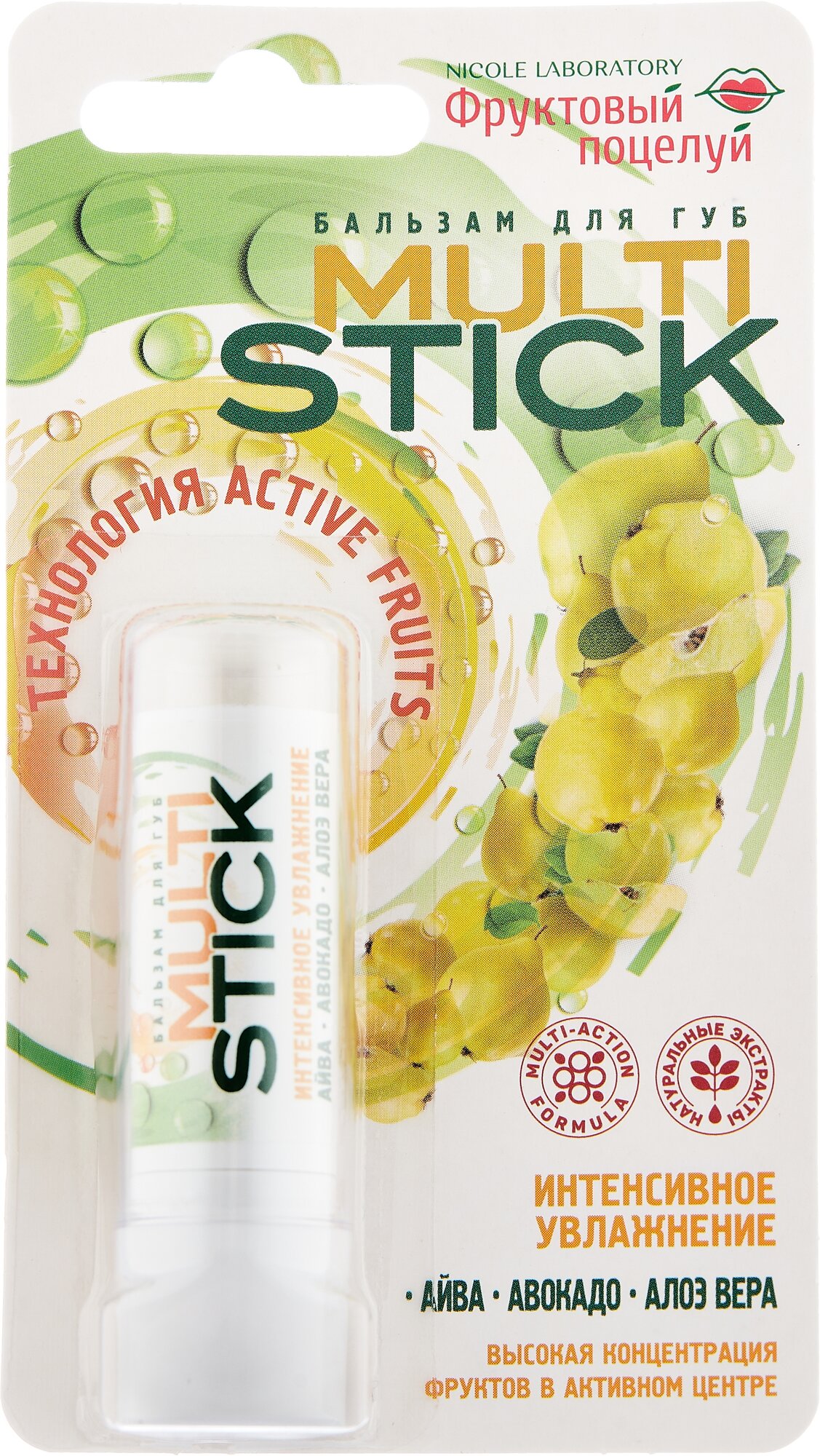 | Полное наименование | Фруктовый поцелуй Бальзам для губ Multistick Интенсивное увлажнение, 4,3 г |