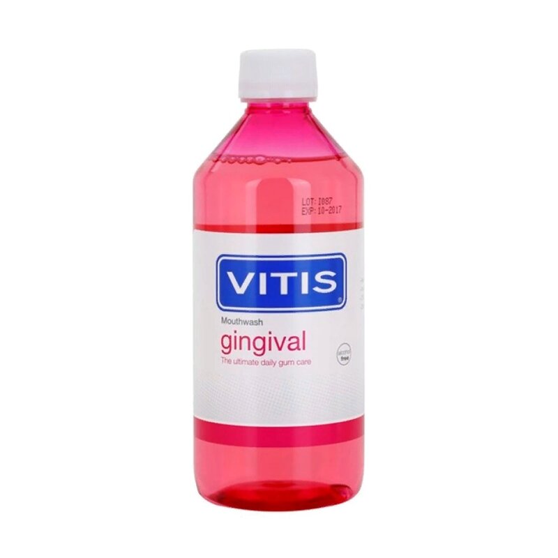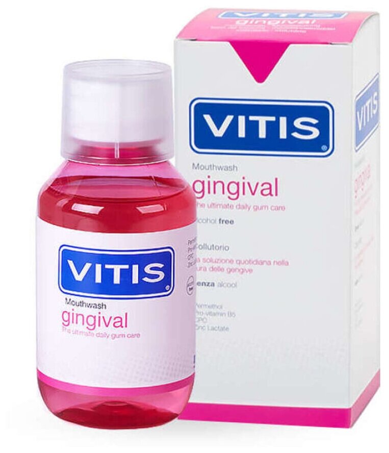 Ополаскиватель полости рта для пациентов с чувствительными деснами Назначение: VITIS Gingival - ополаскиватель ежедневного использования, разработанный для улучшения гигиены полости рта особенно у людей с нежными (чувствительными) деснами. Действующие вещества: Цетилперидиновый хлорид - антисептик ежедневного использования для поддержания здоровья полости рта, предотвращающий образование зубного налета и защищающий десны от инфекций. Лактат цинка - усиливает действие цетилперидинового хлорида и уменьшает опухание десен. Перметол - уменьшает проницаемость и увеличивает стойкость стенок кровеносных сосудов, помогая уменьшить кровоточивость десен. Пантенол или Про-витамин В5 - известен своими заживляющими и противовоспалительными свойствами. Стимулирует регенерацию тканей десны. Рекомендация к применению: После чистки зубов (зубной пастой VITIS gingival), прополоскать ротовую полость 15 мл препарата VITIS Gingival в течение 30 сек. Упаковка: бутылка, 500 мл Арт. 7710