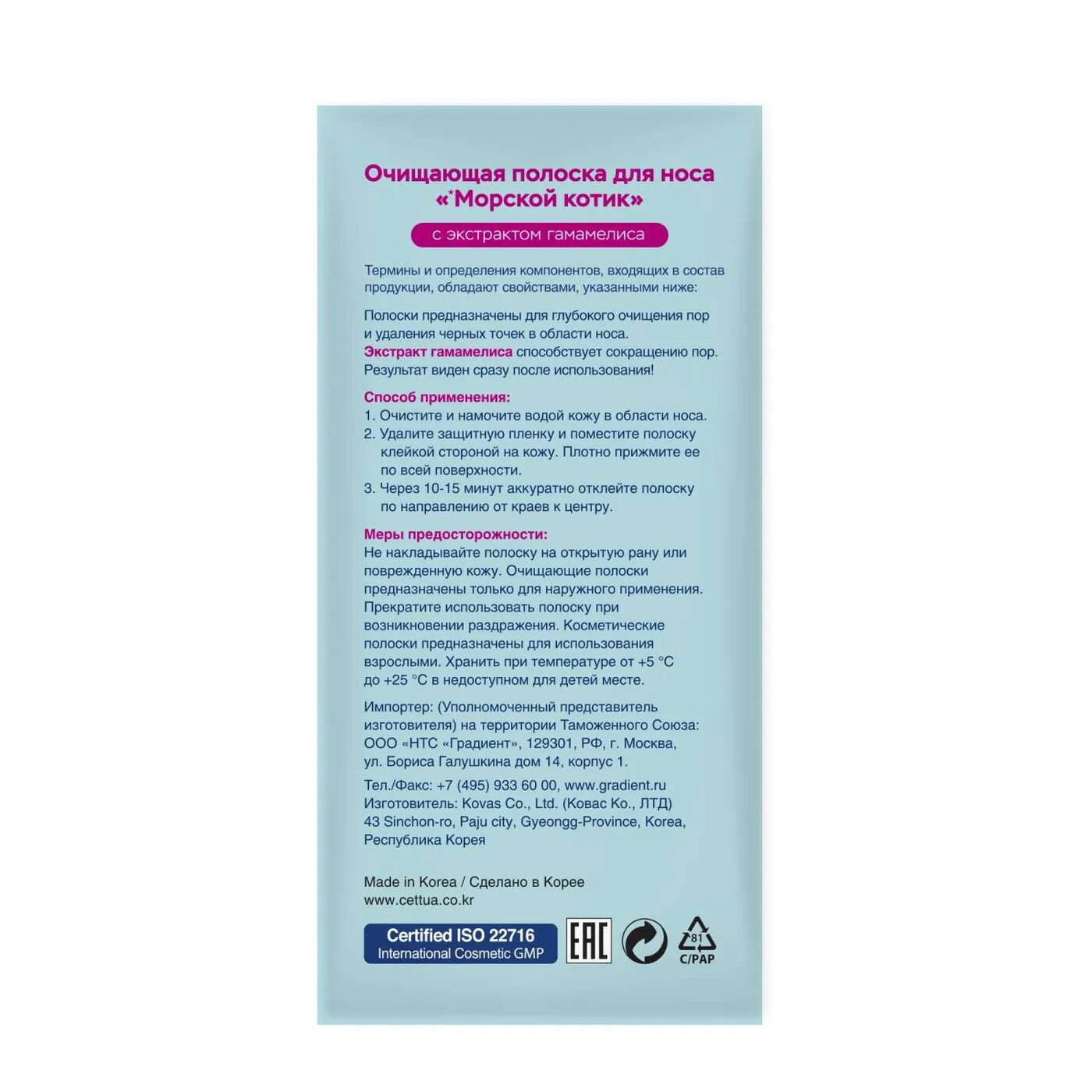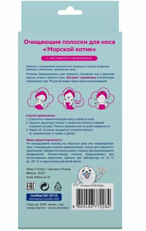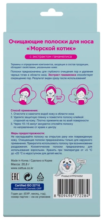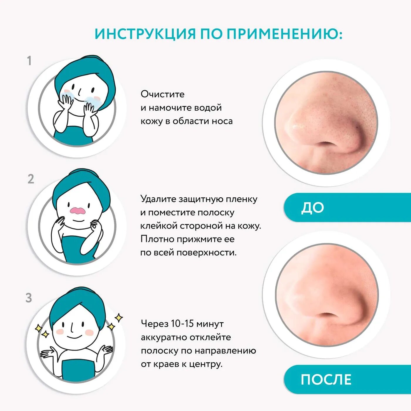 | Способ применения | 1. Очистите и намочите водой кожу в области носа, лба или подбородка 2. Сухими чистыми руками удалите защитную пленку с полосок 3. Поместите полоски клейкой стороной на кожу и плотно прижмите ее по всей поверхности 4. Оставьте полоску на 10-15 минут 5. Аккуратно отклейте полоску по направлению от краев к центру |