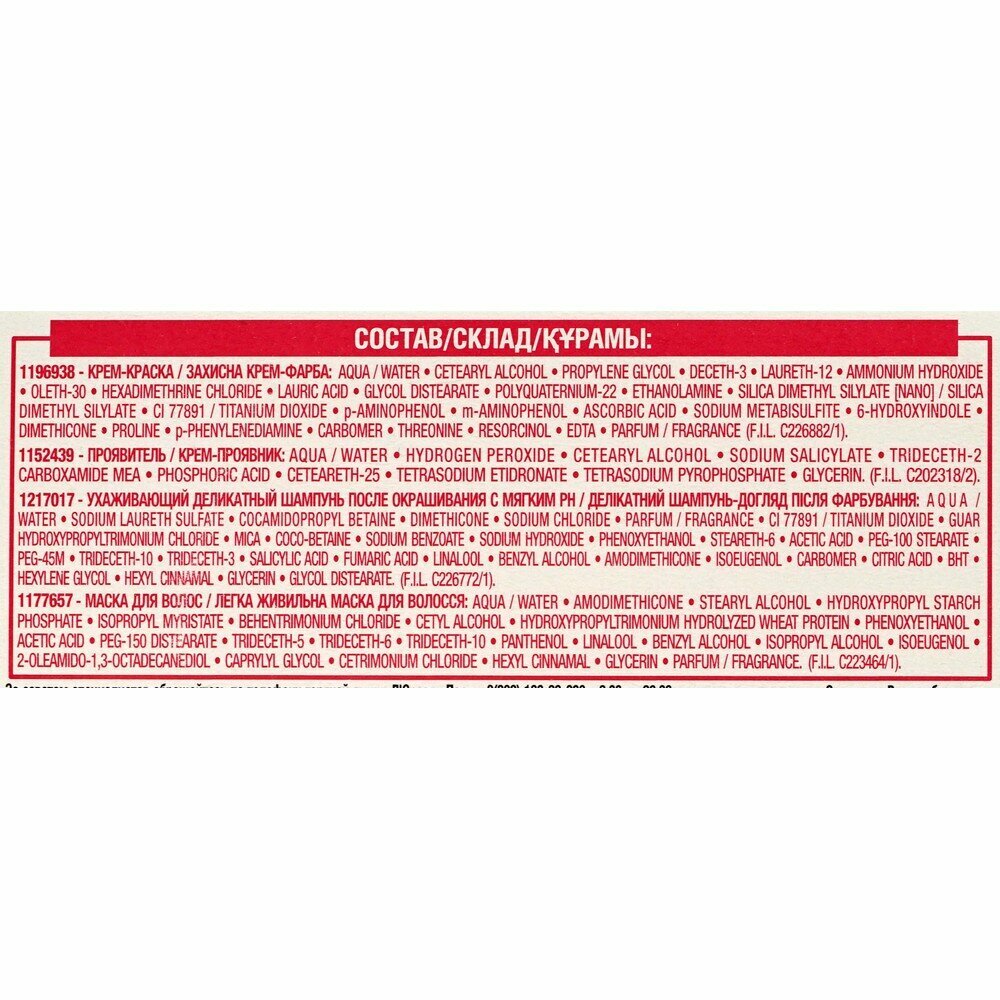| Состав | aqua / water; cetearyl alcohol; propylene glycol; deceth-3; laureth-12; ammonium hydroxide; oleth-30; hexadimethrine chloride; lauric acid; glycol distearate; polyquaternium-22; ethanolamine; silica dimethyl silylate [nano] / silica dimethyl silylate; ci 77891 / titanium dioxide; p-aminophenol; m-aminophenol; ascorbic acid; sodium metabisulfite; thioglycerin; toluene-2; 5-diamine; 2-methylresorcinol; 2-methyl-5-hydroxyethylaminophenol; dimethicone; proline; carbomer; threonine; resorcinol; edta; parfum / fragrance. aqua / water; hydrogen peroxide; cetearyl alcohol; sodium salicylate; trideceth-2 carboxamide mea; phosphoric acid; ceteareth-25; tetrasodium etidronate; tetrasodium pyrophosphate; glycerin. aqua / water; sodium laureth sulfate; cocamidopropyl betaine; dimethicone; sodium chloride; parfum / fragrance; ci 77891 / titanium dioxide; guar hydroxypropyltrimonium chloride; mica; coco-betaine; sodium benzoate; sodium hydroxide; phenoxyethanol; steareth-6; acetic acid; peg-100 stearate; peg-45m; trideceth-10; trideceth-3; salicylic acid; fumaric acid; linalool; benzyl alcohol; amodimethicone; isoeugenol; carbomer; citric acid; bht; hexylene glycol; hexyl cinnamal; glycerin; glycol distearate. 1aqua / water; amodimethicone; stearyl alcohol; hydroxypropyl starch phosphate; isopropyl myristate; behentrimonium chloride; cetyl alcohol; hydroxypropyltrimonium hydrolyzed wheat protein; phenoxyethanol; acetic acid; peg-150 distearate; trideceth-5; trideceth-6; trideceth-10; panthenol; linalool; benzyl alcohol; isopropyl alcohol; isoeugenol; 2-oleamido-1; 3-octadecanediol; caprylyl glycol; cetrimonium chloride; hexyl cinnamal; glycerin; parfum / fragrance |