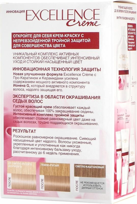 Ритуал тройного ухода: уход за цветом, уход за кожей головы, уход за волосами. Крем-краска с тройным уходом. 100% закрашивание седины. 1. Защищающая крем-краска для волос. Обогащена Про-Кератином и защищающей сывороткой для защиты волос во время окрашивания. Стойкий Цвет 2. Новый этап в ритуале ухода: ухаживающий деликатный шампунь после окрашивания с мягким pH. Деликатно очищает кожу головы и волосы после окрашивания. Насыщенный, естественный цвет 3. Легкая питательная маска для волос. Обогащена Керамидом. Питает волосы, делает их мягкими и блестящими, без утяжеления Перед окрашиванием снимите все украшения. Нанесите увлажняющий крем по линии роста волос, это убережет кожу шеи и лица от нежелательного окрашивания. Пройдите тест на аллергию, краска для волос не должна вызывать неприятных ощущений на коже. Защитная сыворотка наносится на волосы до окрашивания. После окрашивания используйте бальзам, смойте его холодной водой для придания блеска волосам. Перед применением ознакомьтесь с инструкцией.