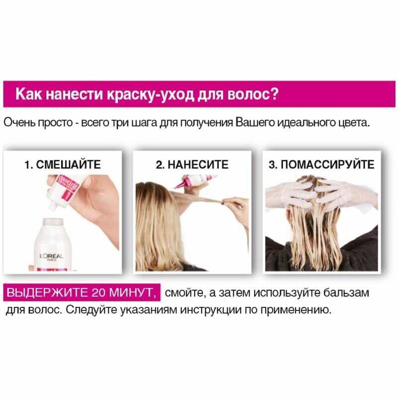 | Способ применения | Нанесите краску на волосы на расстоянии 3-4 см от кожи головы и распределите равномерно до кончиков. Покраску начинайте с затылка, убедитесь что волосы равномерно насыщенны краской. Для прокрашивания корней обязательно сделайте тест на аллергенность вашей кожи к этой краске. |