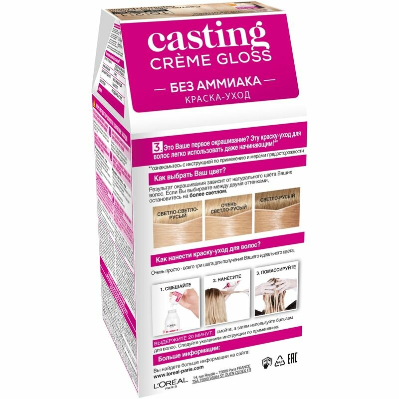 В состав упаковки входит: красящий крем без аммиака (48 мл), тюбик с проявляющим молочком (72 мл), флакон с бальзамом для волос с Маслом Кокоса (60 мл), пара перчаток, инструкция по применению. Краска для волос "Casting Creme Gloss" легка в использовании, благодаря наличию специального флакона аппликатора, нанесение краски становится точным и простым. Полная информация о процедуре окрашивания содержится в инструкции.