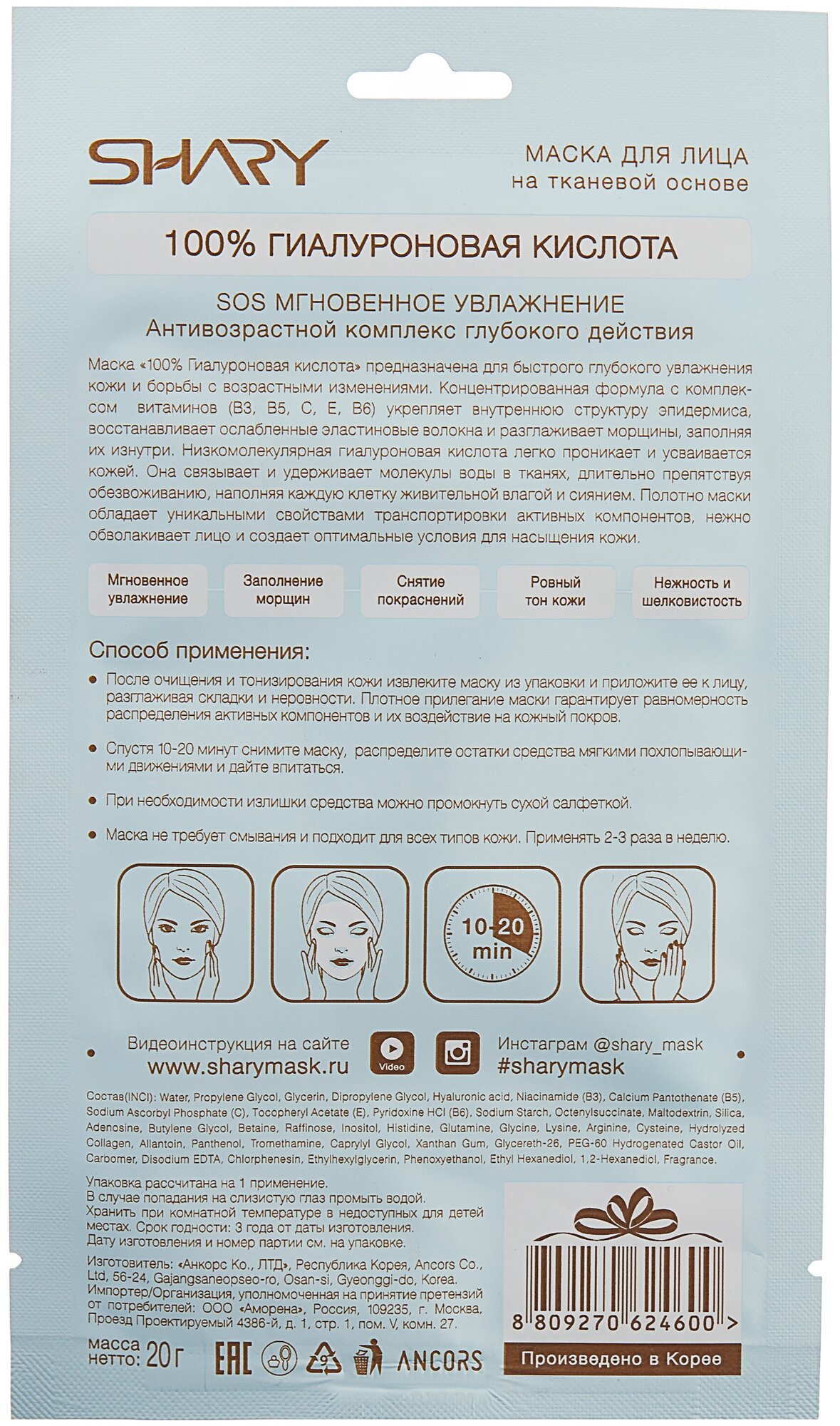 Маска для лица на тканевой основе 100% гиалуроновая кислота Shary 20г Ancors Co.,Ltd (1252667)