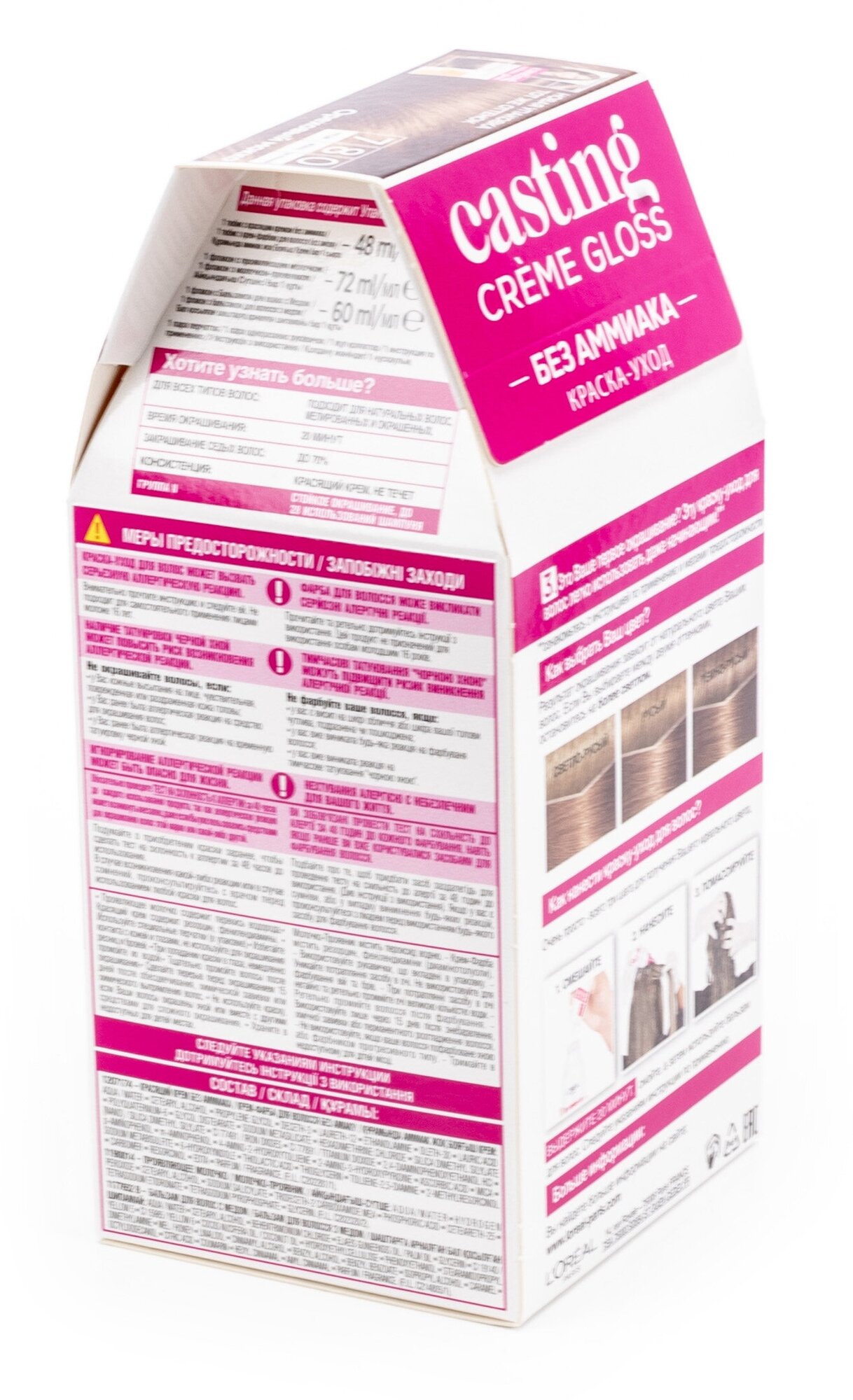 В состав упаковки входит: красящий крем без аммиака (48 мл), тюбик с проявляющим молочком (72 мл), флакон с бальзамом для волос с Медом (60 мл), пара перчаток, инструкция по применению. Краска для волос "Casting Creme Gloss" легка в использовании, благодаря наличию специального флакона аппликатора, нанесение краски становится точным и простым. Полная информация о процедуре окрашивания содержится в инструкции.