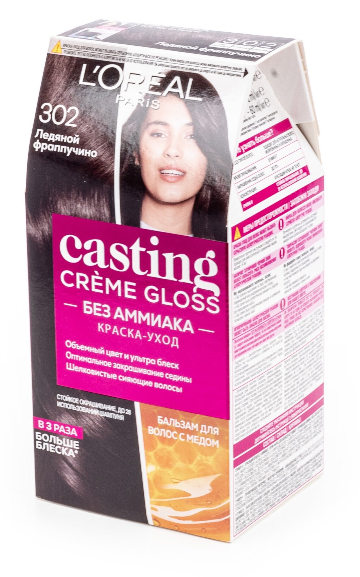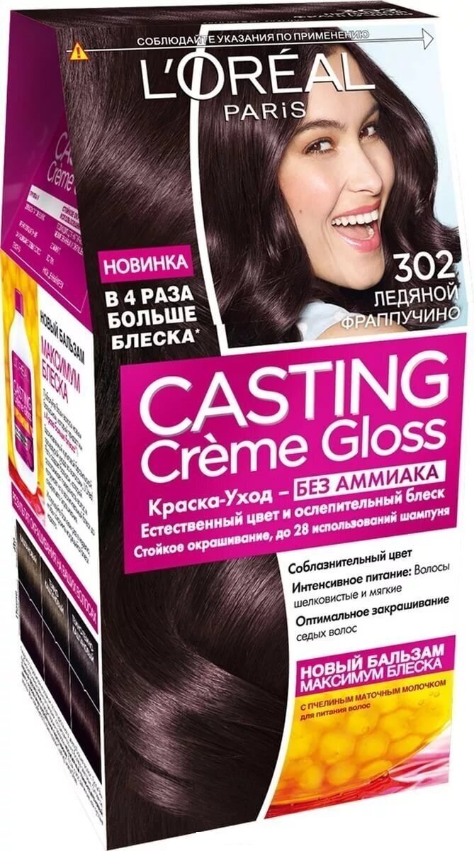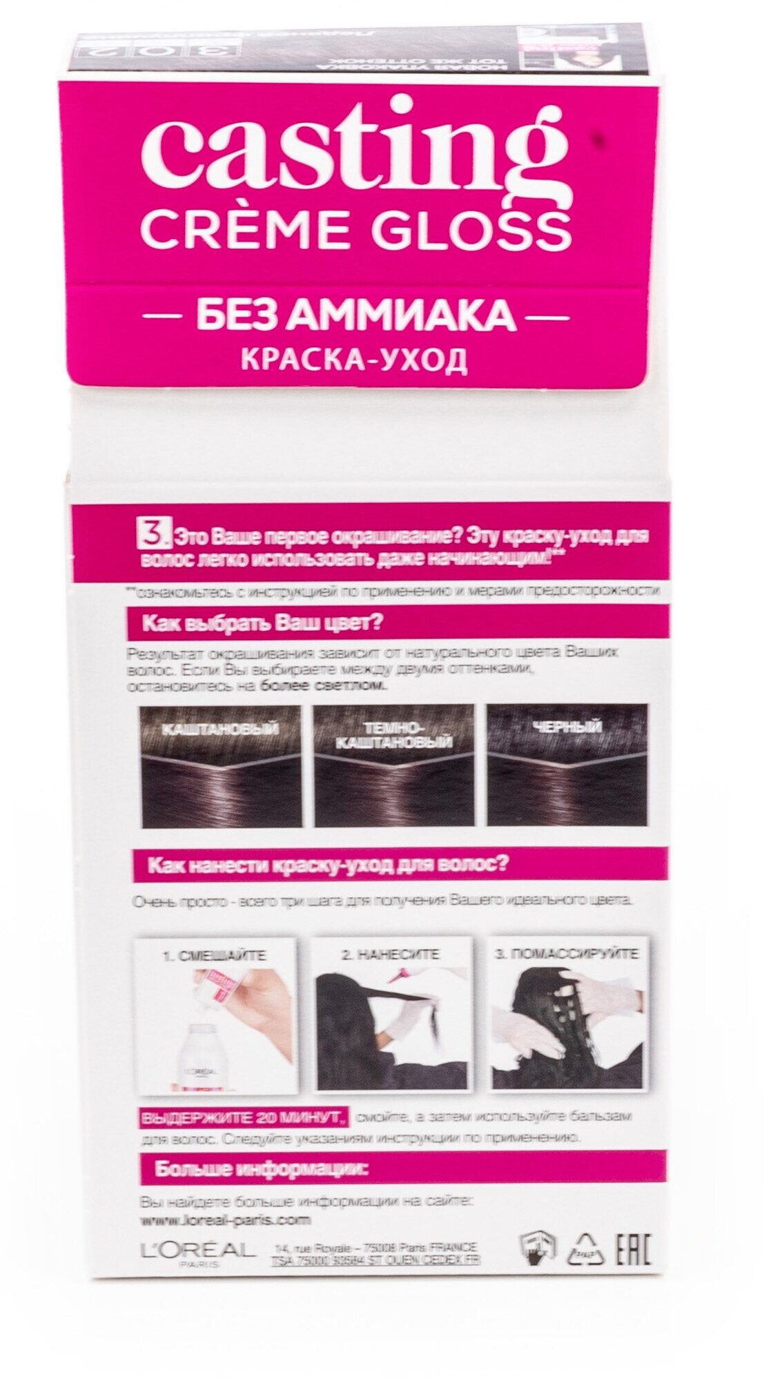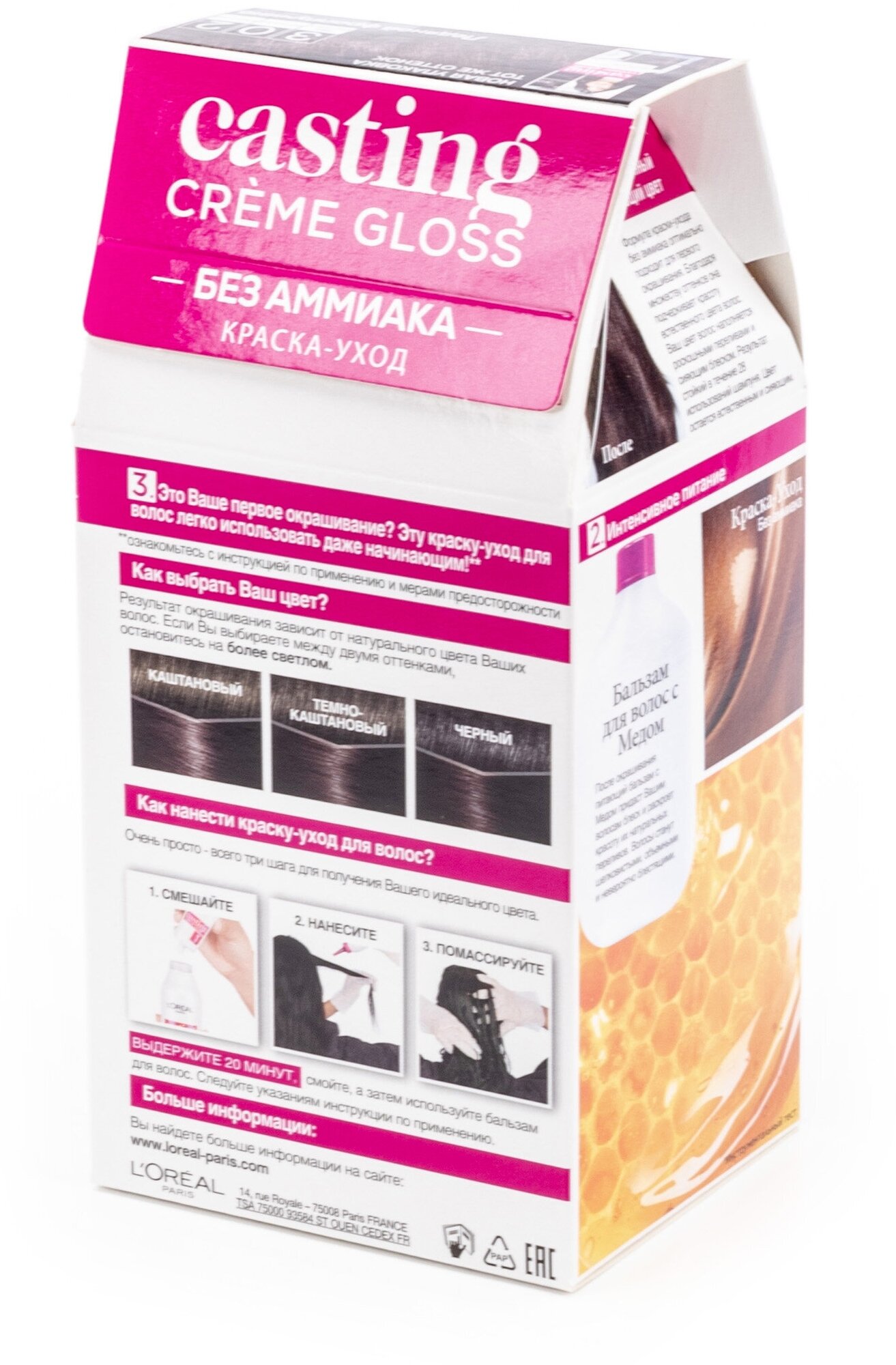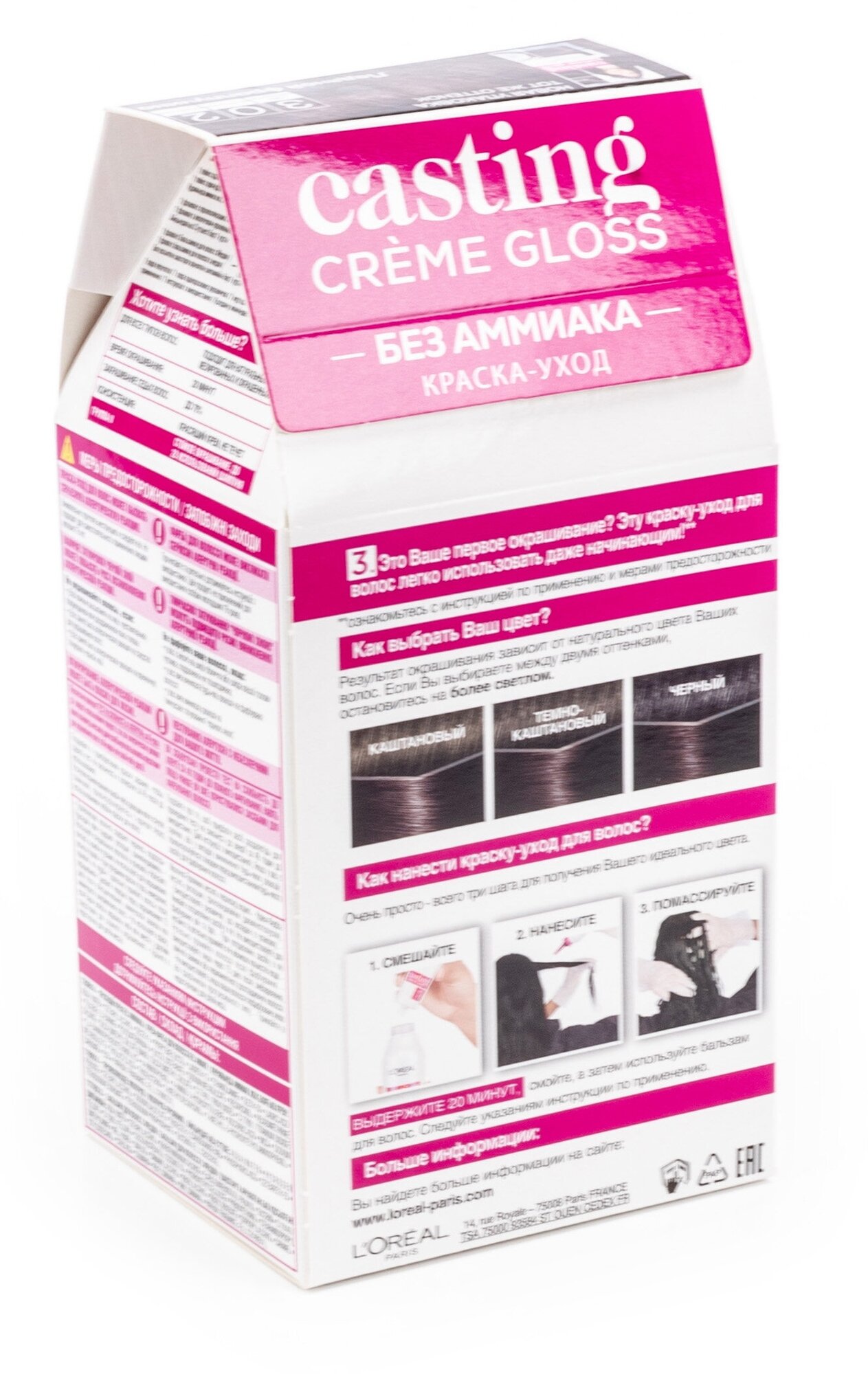 В состав упаковки входит: красящий крем без аммиака (48 мл), тюбик с проявляющим молочком (72 мл), флакон с бальзамом для волос с Орехом (60 мл), пара перчаток, инструкция по применению. Краска для волос "Casting Creme Gloss" легка в использовании, благодаря наличию специального флакона аппликатора, нанесение краски становится точным и простым. Полная информация о процедуре окрашивания содержится в инструкции.
