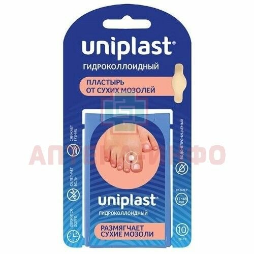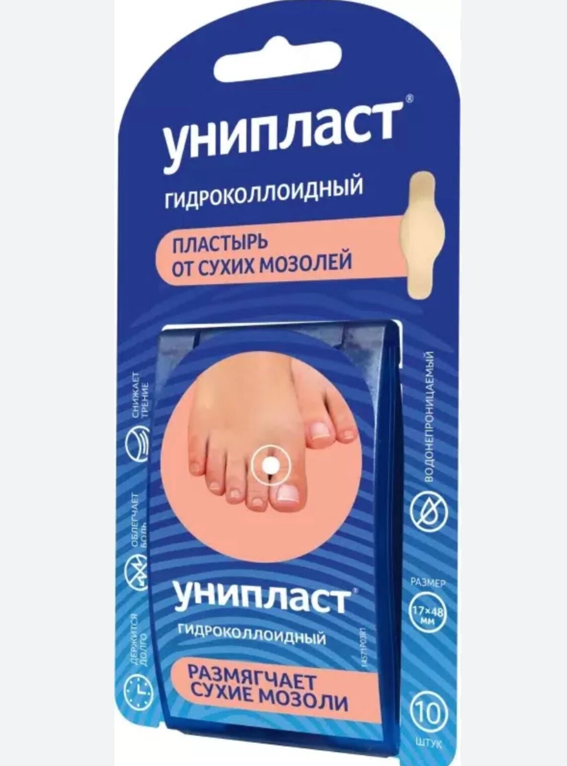 Cухие мозоли. · Индивидуальная непереносимость;· Не использовать для инфицированных ран. Полиуретановая плёнка, термоплавкий клей, карбоксиметилцеллюлозы натриевая соль, полиизобутен, пропиленгликоль, подкладочная бумага. Пластырь «UNIPLAST®» гидроколлоидный от сухих мозолей посредством поддержания естественного уровня увлажненности предотвращает пересыхание кожи, размягчает сухие мозоли и способствует их более легкому удалению.- изделие нестерильно, предназначено для одноразового использования;- перед применением убедиться в целостности упаковки;- использовать до окончания срока годности. Пластырь «UNIPLAST®» гидроколлоидный предназначен для эффективной защиты мозолей и натоптышей от загрязнения, намокания, воздействия внешней среды, бактерий, поддержания естественного уровня увлажнённости, адсорбции экссудата из мозолей, уменьшения боли, создания оптимальных условий для заживления, а также для предотвращения образования мозолей и натоптышей. · Предотвращают появление мозолей· Облегчают боль· Водонепроницаемые· Предотвращают трение· Способствуют заживлению мозоли· Пластырь можно применять 24 часа в сутки до заживления мозоли · Предотвращают появление рубцов и шрамов Вымыть руки перед применением. Поверхность мозоли или натоптыша промыть водой и мылом, в случае повреждения кожи обработать антисептическим раствором. Просушить и наложить пластырь, предварительно сняв с пластыря защитную плёнку. После наклеивания желательно прогреть пластырь теплом руки. Пластырь снимать не нужно, он может оставаться на коже, пока сам не отклеится от мозоли или натоптыша. Пластырь рекомендуется применять 24 часа в сутки до заживления мозоли или натоптыша. Возможны реакции гиперчувствительности. При необходимости проконсультируйтесь с фармацевтом или врачом. Перед применением пластыря у детей младше 3-х лет необходимо проконсультироваться с врачом. Перед применением пластыря лицам с сахарным диабетом необходимо проконсультироваться с врачом.