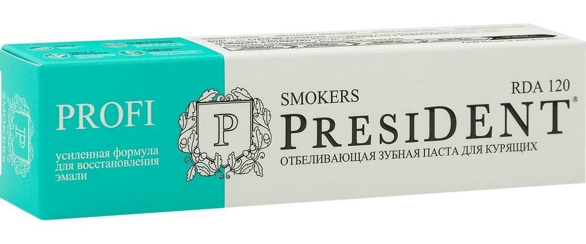 Зубная паста President PROFI Smokers очищает от налета, нейтрализует запах табака, придает белизну и блеск эмали, реминерализирует эмаль. Имеет усиленную формулу для восстановления эмали: гидроксиапатит, фтор в содержании 1350 ppm. Благодаря строгому контролю за размером и концентрацией абразивных частиц, безопасно и эффективно удаляет налет.