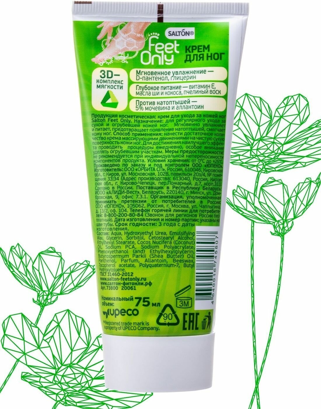 Отличный крем, как раз для проблемных пяточек, как мои. Крем для ног Salton Feet Only хорошо увлажняет кожу ног, питает и предотвращает появление натоптышей. Состав классный, хорошо и быстро впитывается, нет ощущения липкости. И очень приятный легкий травяной аромат. Вообще это лучший крем для ног, что я покупала. Буквально с первого нанесения вижу его эффективность.