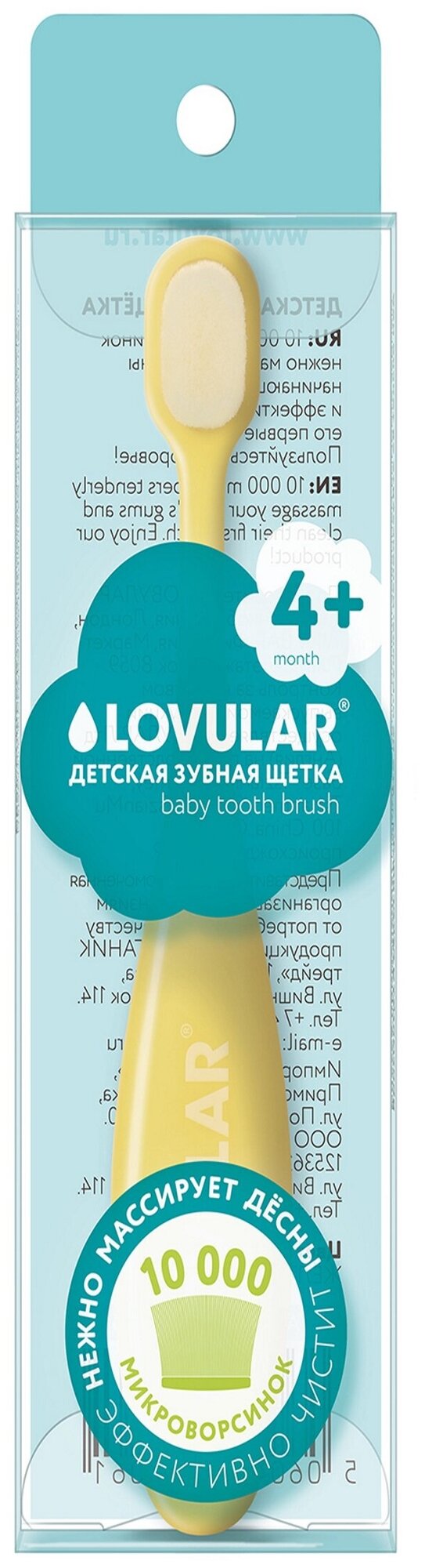 Первая зубная щетка понадобится вашему малышу, как только у него прорежутся первые молочные зубки! Доверьте гигиену полости рта младенца Lovular — английскому бренду-производителю товаров правильной детской гигиены! Особенности: Детская зубная щётка от Lovular, словно заботливая зубная фея, поможет эффективно очистить первые зубки малыша, благодаря 10 000 микроворсинок! Ультрамягкая щетина и небольшая головка (примерно на 2 детских зубика) бережно очистит зубы начинающего чистюли, а также станет массажером для десен. Она поможет при зудящей боли при прорезывании зубов. Ручка детской щетки выполнена из мягкого нескользящего материала. Она имеет специальную округлую форму и длину, чтобы ребенок мог легко удержать щетку в руках. Приучайте малыша к правильной гигиене полости рта с раннего детства вместе с Lovular! Проводите чистку зубов младенцу сначала самостоятельно. По мере взросления ребёнка помогайте ему «дочищать» зубки, чтобы полностью удалить налет и остатки пищи. Такую повторную чистку рекомендуется делать регулярно примерно до 5 лет, пока ребенок не научится правильно и хорошо чистить зубы самостоятельно. Перед первым использованием щётки вымойте её тёплой водой с мылом.