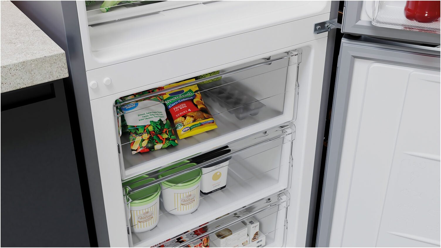 С четырьмя полками на двери холодильной камеры вы можете разместить бутылки, пакеты с молоком или другие мелкие предметы.