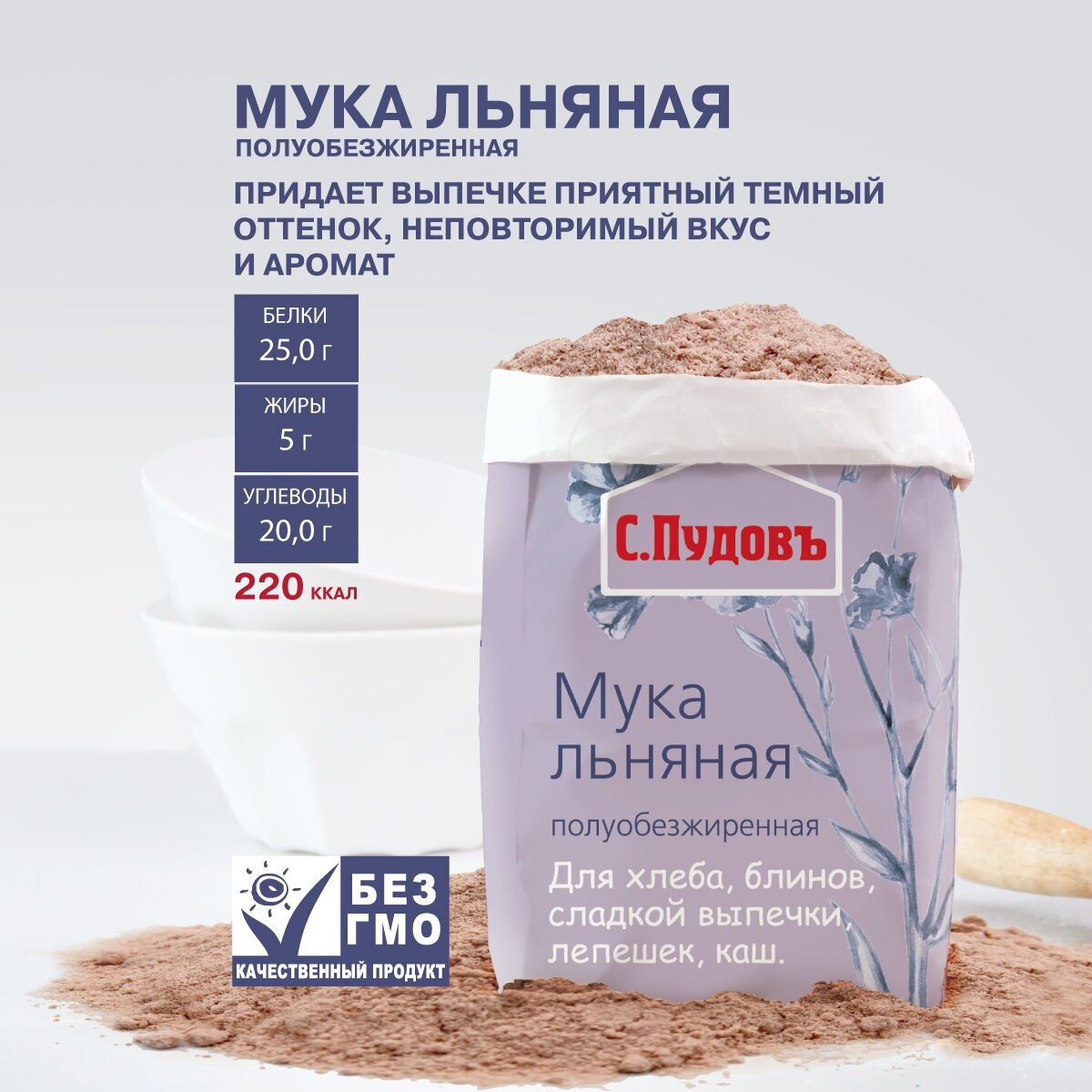 Описание товара:Мука льняная полуобезжиренная С.Пудов. Для хлеба, блинов, сладкой выпечки, лепешек, каш. Мука льняная придает выпечке приятный коричневатый оттенок, неповторимый вкус и аромат.Состав товара:Мука льняная.Меры предосторожности:Хранить в сухих, чистых, хорошо вентилируемых помещениях, не зараженных вредителями хлебных запасов при относительной влажности воздуха не более 70%. Может содержать следы глютена, сои, молока, орехов, арахиса, кунжута, сельдерея, горчицы.