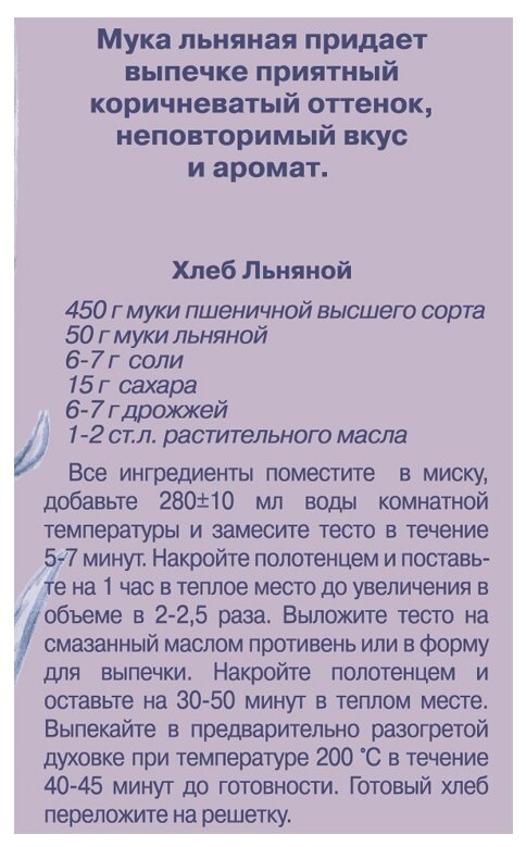 Семья в восторге! Отличная мука. Пеку хлеб, заменяю часть пшеничной муки на обдирную по совету врача, вот попробовала льняную - хлеб без постороннего привкуса, красивый, пушистый, "загорелый"))) дети и муж просят теперь только его)) пробовала добавлять эту муку и в блины, и запеканку - не портит, всё хорошо.