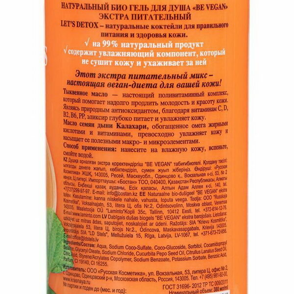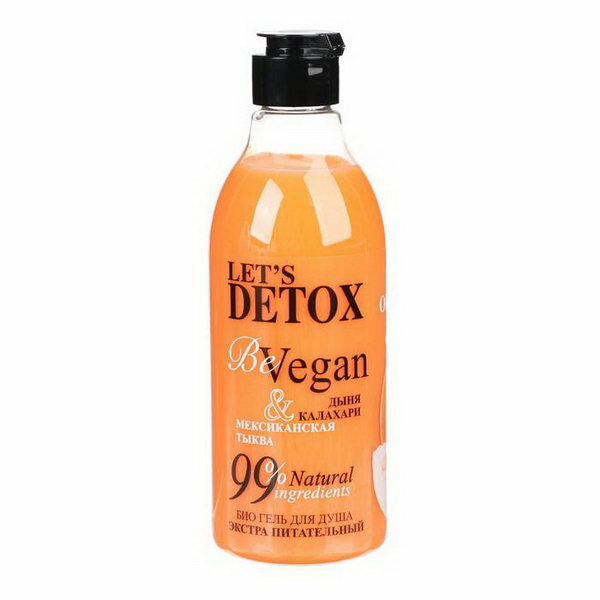 LETS DETOX - натуральные коктейли для правильного питания и здоровья кожи. В качестве моющей основы натуральные ПАВы. Гели для душа состоят на 99% из натуральных ингредиентов. Содержит увлажняющий компонент, который не сушит кожу и ухаживает за ней. Этот экстра питательный микс - настоящая веган-диета для Вашей кожи. Тыквенное масло - настоящий поливитаминный комплекс, который помогает надолго продлить молодость и красоту кожи. Являясь природным антиоксидантом, благодаря витаминам С, D, В2, В6, РР, эликсир глубоко питает и увлажняет кожу. Масло семян дыни Калахари, обогащенное омега жирными кислотами и витаминами, превосходно увлажняет кожу и насыщает ее полезными макро- и микроэлементами.