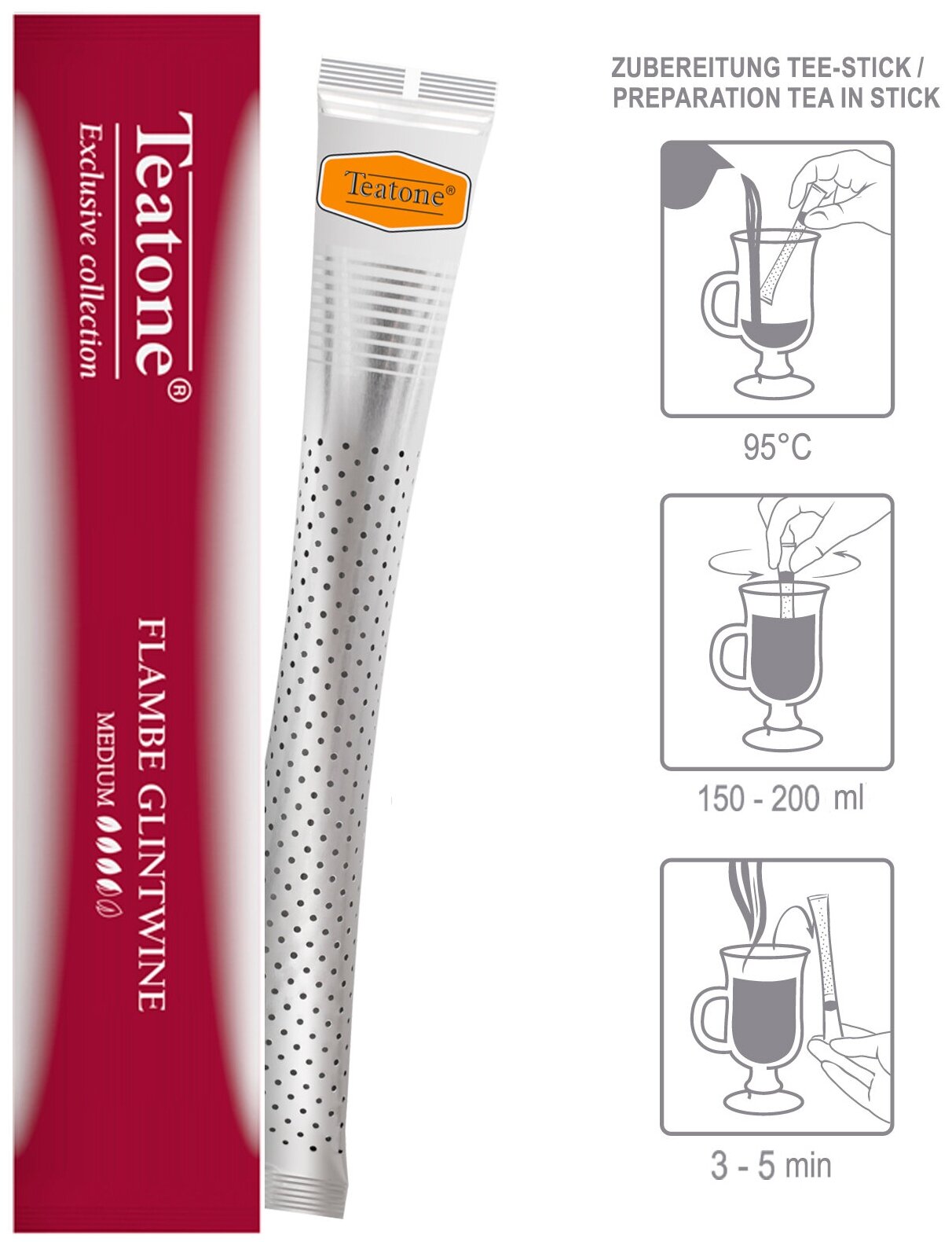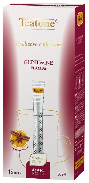 Чайный напиток "Glintwine Flambe" от "Teatone" - напиток, создающий теплую и уютную атмосферу. Пряный аромат специй и сочного апельсина подарит бодрость и согреет летним теплом. Чай упакован в индивидуальную упаковку "стик". Преимущества чайного стика Teatone- заменяет ложку- не оставляет капель и брызг- в стиках используется листовой чай высшего качества и кусочки фруктов и специй.
