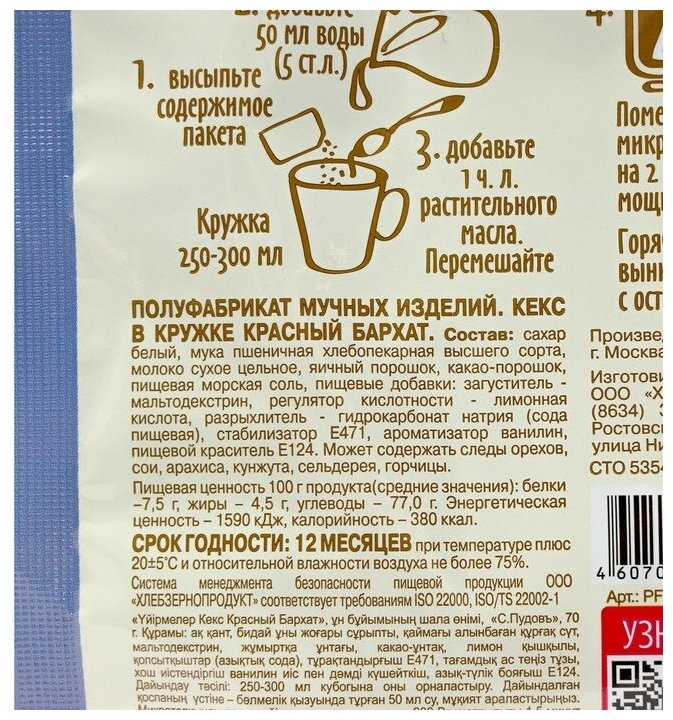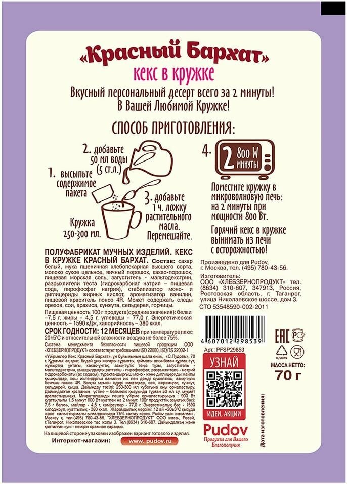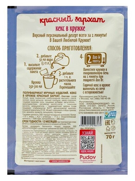 Супер-новинка от «С. Пудовъ», благодаря которой вы за 120 секунд получите потрясающий и великолепный десерт. В процессе его создания мы использовали только натуральные и самые лучшие ингредиенты. Идеально подходит для скорых завтраков, обеденных перерывов в офисе и десертов после ужина. «Красный бархат в кружке» - персональный десерт всего за 2 минуты в вашей любимой кружке!Состав: cахар белый, мука пшеничная хлебопекарная высшего сорта, молоко сухое цельное, яичный порошок, какао-порошок, пищевая морская соль, загуститель - мальтодекстрин, разрыхлители теста ( гидрокарбонат натрия - пищевая сода, пирофосфат натрия), стабилизатор моно- и диглицериды жирных кислот, ароматизатор ванилин, пищевой краситель понсо 4R. Может содержать следы сои, орехов, арахиса, кунжута, сельдерея, горчицы.Пищевая ценность в 100 г готового продукта: белки: 7,5 г жиры: 4,5 г углеводы: 77,0 г Энергетическая ценность: 1590 кДж, калорийность: 380 ккал.Срок годности: 12 месяцев. Хранить при температуре +20±5С и относительной влажности воздуха не более 75%.