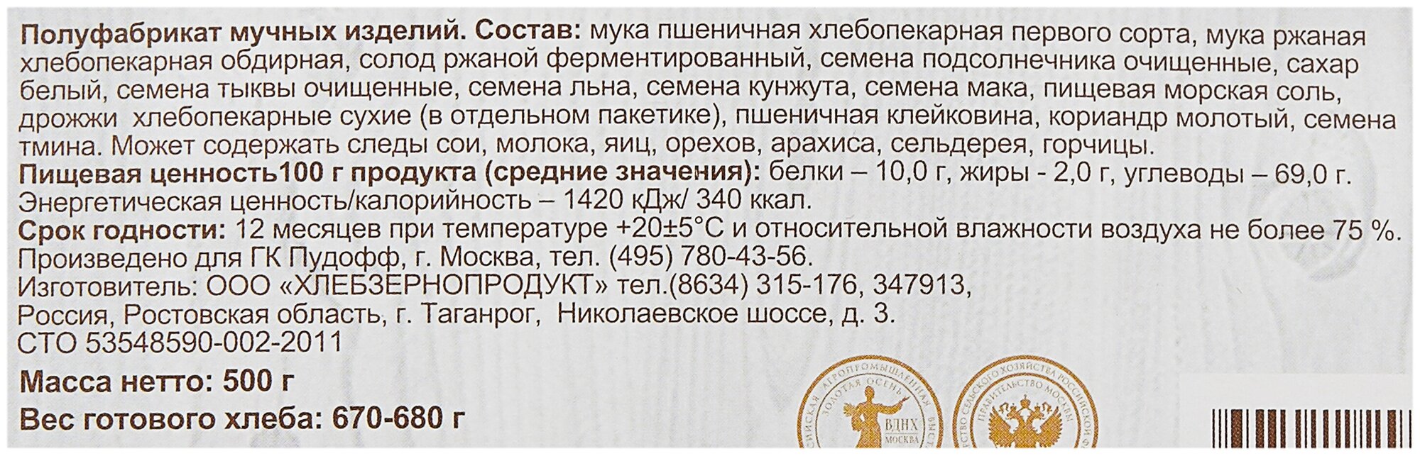 | Состав | мука пшеничная хлебопекарная первого сорта, мука ржаная обдирная, солод ржаной ферментированный, семена подсолнечника очищенные, сахар-песок, семена тыквы очищенные, семена льна, семена кунжута, семена мака, пищевая поваренная морская соль, дрожжи хлебопекарные сухие (в отдельном пакетике), пшеничная клейковина, кориандр молотый, семена тмина. Без ГМО Пищевая ценность 100 г продукта |