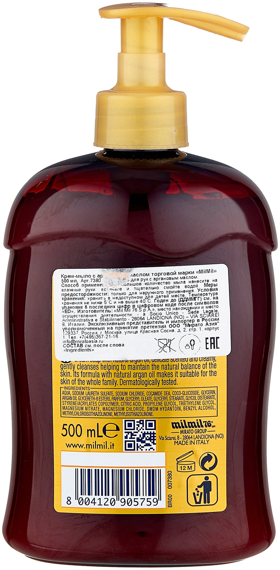 Mil Mil Крем-мыло c аргановым маслом, 500 мл. Аромат с мягкой, но с глубокой и элегантной композицией на основе золотистых нот ванили, жасмина, сандалового дерева и бергамотового масла. Оказывает очищающий и бережный уход за кожей рук. Мягко очищает и питает кожу во время мытья. Содержит вещества с питательным эффектом. Мягкий для кожи и не вызывает раздражения. Создает густую и кремовую пену. Оставляет кожу ароматно пахнущей и ухоженной на весь день. Протестировано и рекомендовано к приеменению европейскими дерматологами.