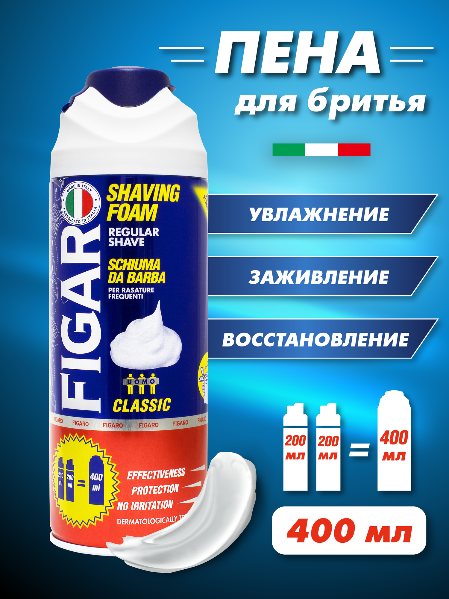 Пена для бритья Figaro ласково ухаживает и защищает кожу. Предотвращает раздражение кожи после бритья. Формула три в одном: увлажняет, защищает и нежно заботится о вашей коже. Обеспечивает приятное бритьё в труднодоступных для бритвы местах. Дерматологически тестирована.