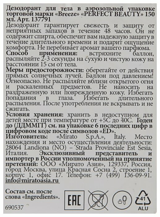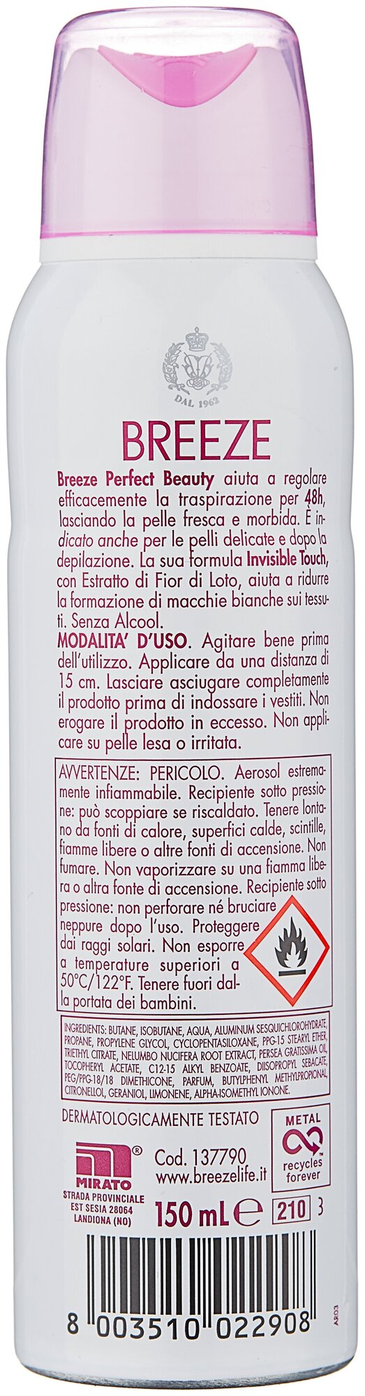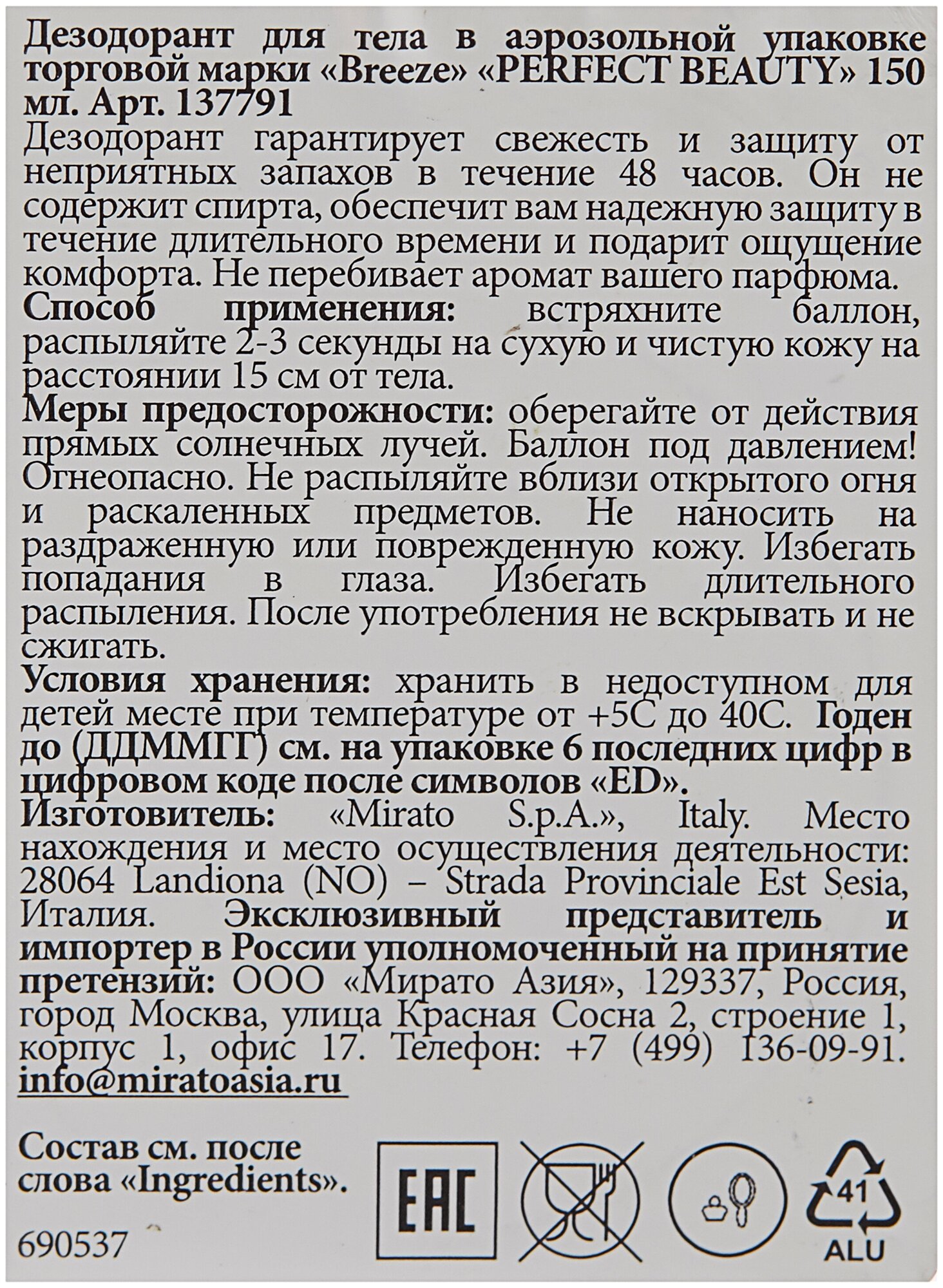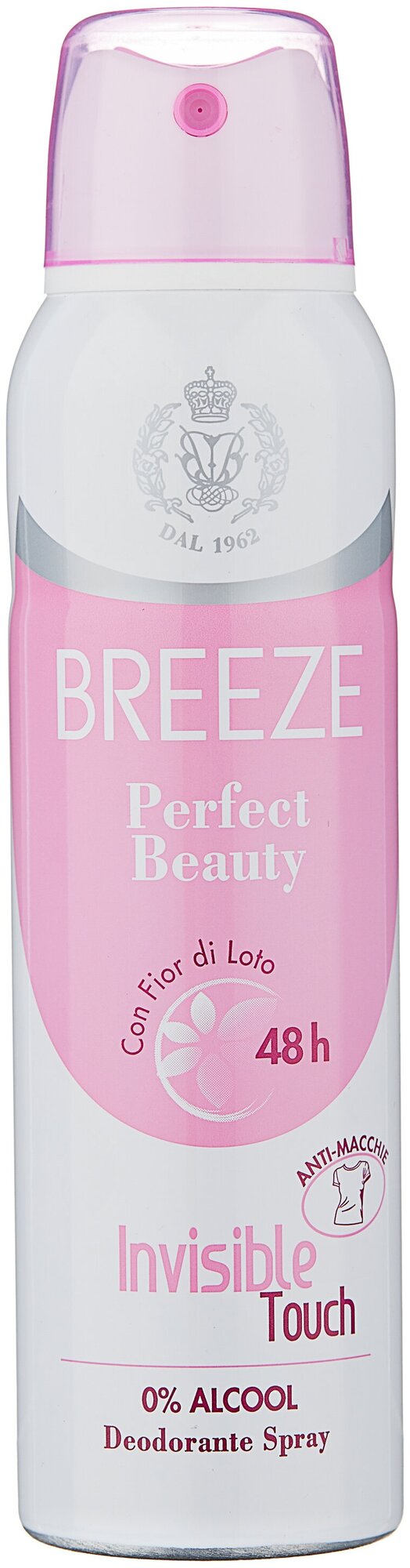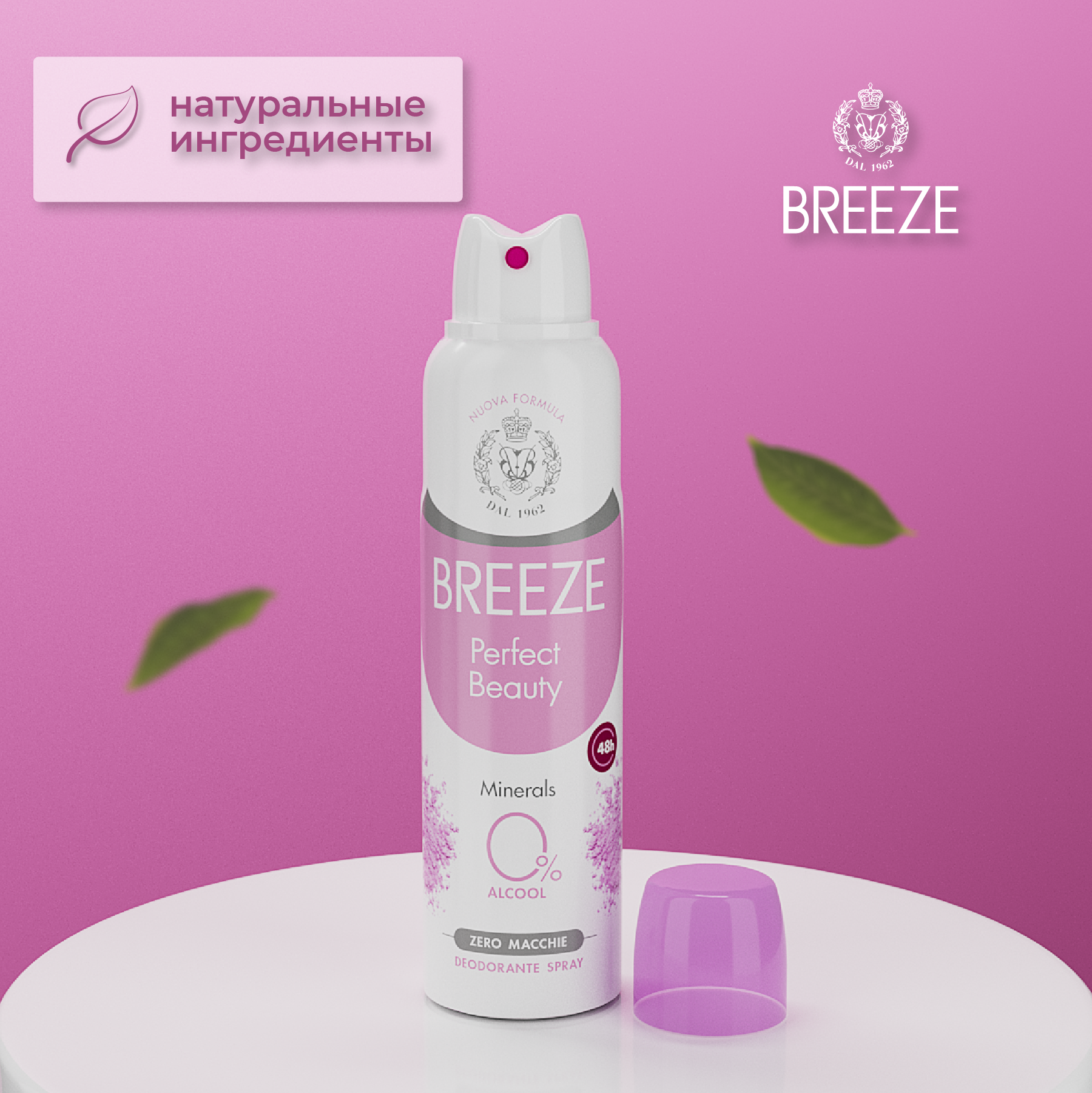 Дезодорант для тела в аэрозольной упаковке PERFECT BEAUTY торговой марки Breeze. Дезодорант гарантирует свежесть и защиту от неприятных запахов в течение 48 часов. Благодаря формуле невидимого прикосновения с экстрактом цветка лотоса помогает уменьшить образование белых следов на одежде. Подходит для чувствительной кожи.