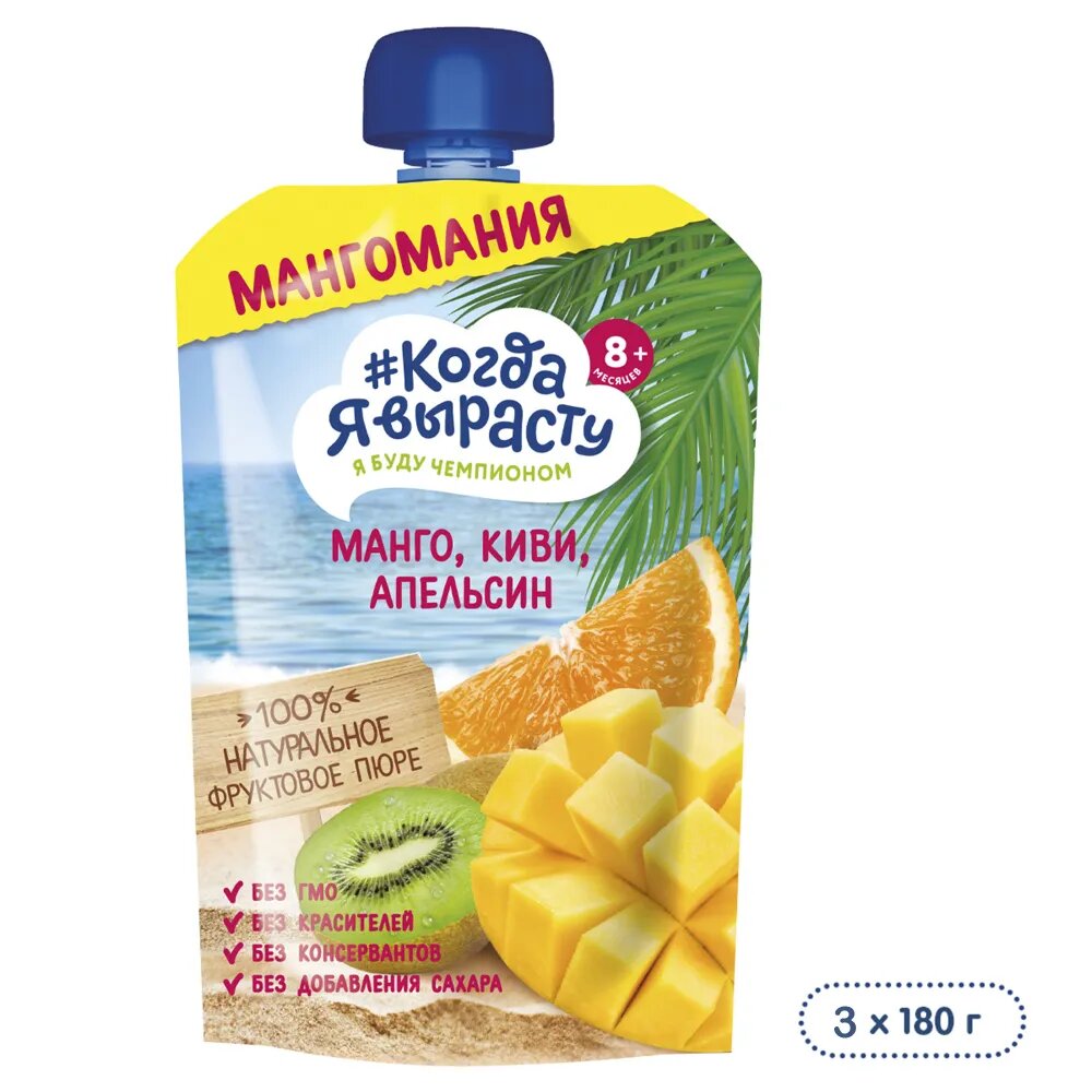 Когда Я вырасту - первый российский бренд для заботливых мам, которые выбирают для своих малышей полезные и безопасные продукты! Фруктовое пюре "Манго, киви, апельсин" - это сбалансированный и полезный десерт, рекомендован для питания детей старше 6 месяцев. Серия пюре Мангомания отличается повышенным содержанием в составе пюре экзотических фруктов. Однородная (гомогенизированная) консистенция прекрасно передает вкус и полезные свойства фруктов. Наслаждайтесь вкусами лета! Большая упаковка пюре (180 грамм) - излюбленный перекус не только малышей и деток постарше, но и школьников, подростков, взрослых, соблюдающих здоровый образ жизни. Удобная, современная упаковка - пауч, полностью сохраняет свойства фруктов, занимает мало места в сумочке и холодильнике, её удобно брать в дорогу и на прогулку!