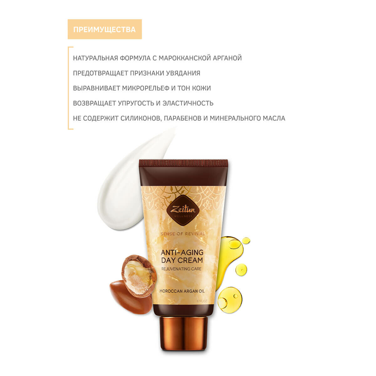 Откройте ресурс молодости Вашей кожи с дневным антивозрастным кремом для лица из SPA-коллекции Zeitun Wellness " Ритуал восстановления". Благодаря натуральной омолаживающей формуле на основе марокканской арганы крем эффективно препятствует появлению признаков старения и устраняет их, разглаживает морщины, нейтрализует свободные радикалы и последствия дневного стресса. Кожа становится заметно более эластичной, активизируется клеточное обновление, контуры лица становятся более четкими и подтянутыми. Не содержит силиконов, парабенов и минерального масла. Способ применения: нанесите на чистую кожу лица, дождитесь полного впитывания.
