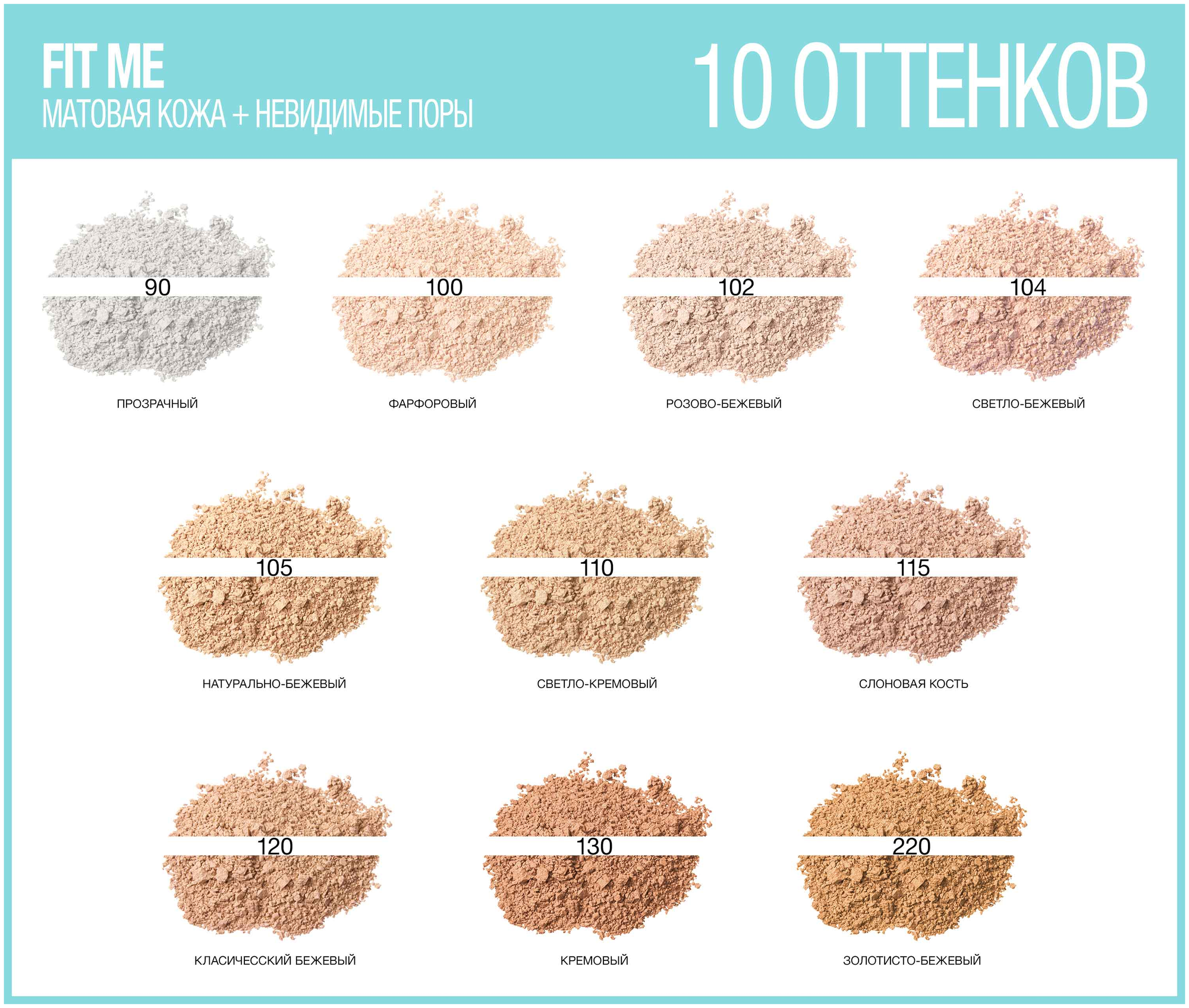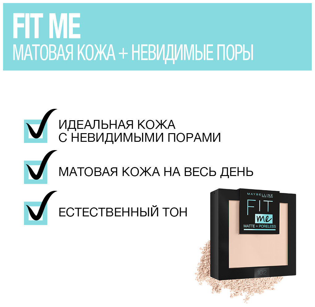 Уникальная текстура пудры Maybelline New York Fit Me придает матирующий эффект, скрывает поры и идеально подстраивается под тон кожи. Кожа выглядит естественно матовой и безупречной. Данный оттенок подходит светлой коже с теплым подтоном.