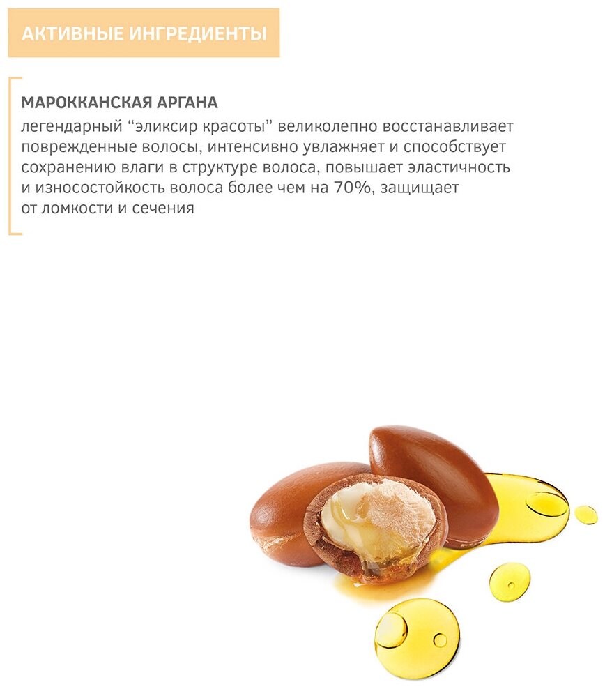 | Состав | aqua, cetearyl alcohol, helianthus annuus (sunflower) seed oil, behenamidopropyl dimethylamine, glycerin, polyquaternium-22, cera alba (beeswax), butyrospermum parkii (shea) butter, argania spinosa (argan) kernel oil, hippophae rhamnoides (sea buckthorn) fruit oil, polyquaternium-7, polyquaternium-10, lactic acid, hydrogenated ethylhexyl olivate, hydrogenated olive oil unsaponifiables, hydrolyzed keratin, stearyl stearate, cetyl palmitate, paraffin, tocopherol, benzyl alcohol, ethylhexylglycerin, parfum |