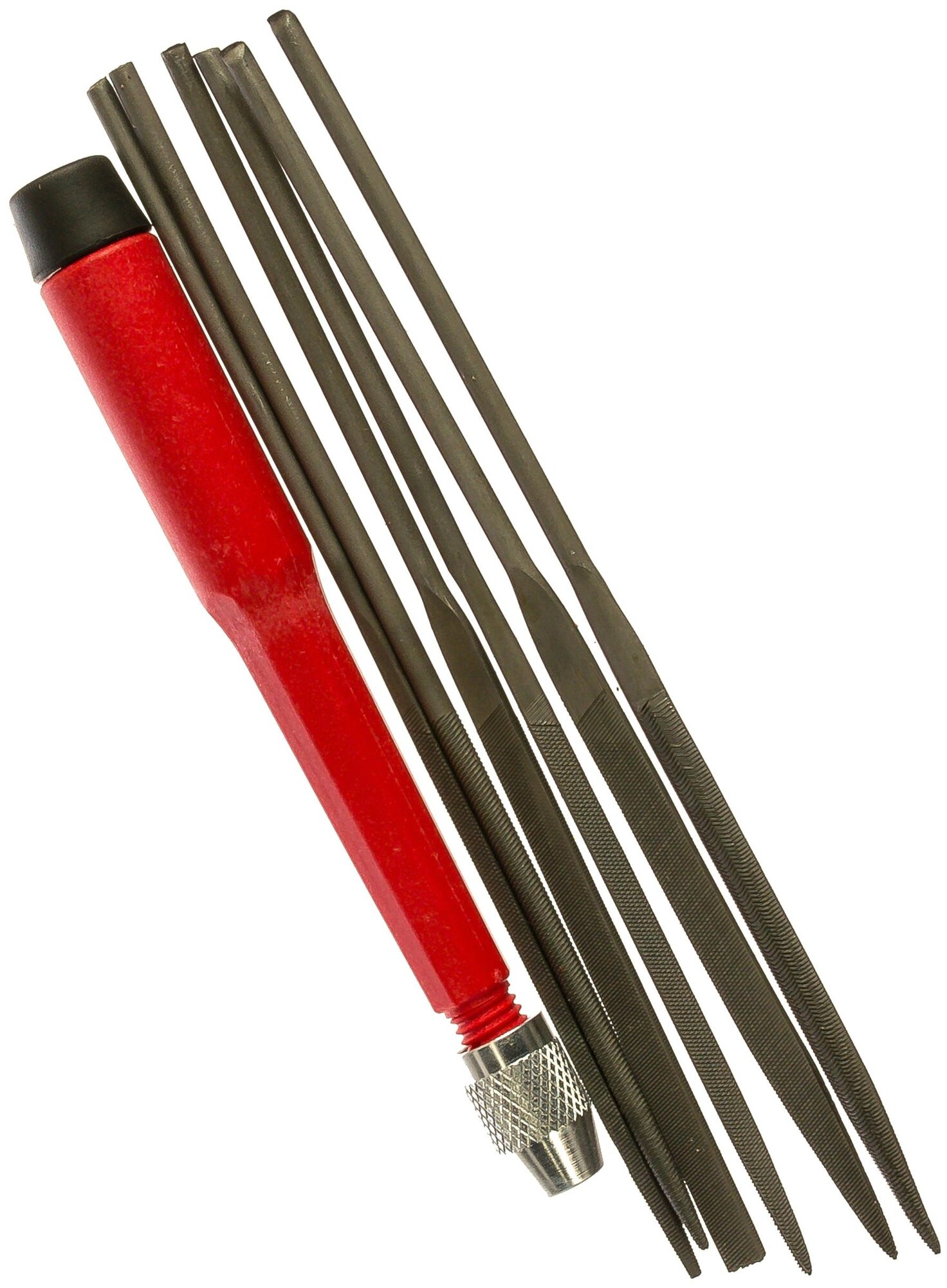 Надфили с зажимной пластмассовой ручкой Зубр "Мастер" 16053-H6 - профессиональный режущий инструмент для тонкой обработки металлических поверхностей. Удобная быстро зажимная рукоятка обеспечивает быструю смену надфиля и комфорт во время работы. Двойная насечка зубьев повышает производительность опиливания металлических заготовок высокой твердости.. Пластиковая рукоятка обеспечивает надежный захват и комфортную работу.. Подходит для широкого спектра сфер применения. Удобная упаковка для компактного хранения.Для тонкой обработки поверхностей различной формы, острых кромок и выступов, а также для снятия заусенцев.ПреимуществаИзготовлены из качественного материала- выдерживают высокие нагрузкиОбладают высокой прочностью и долговечностью