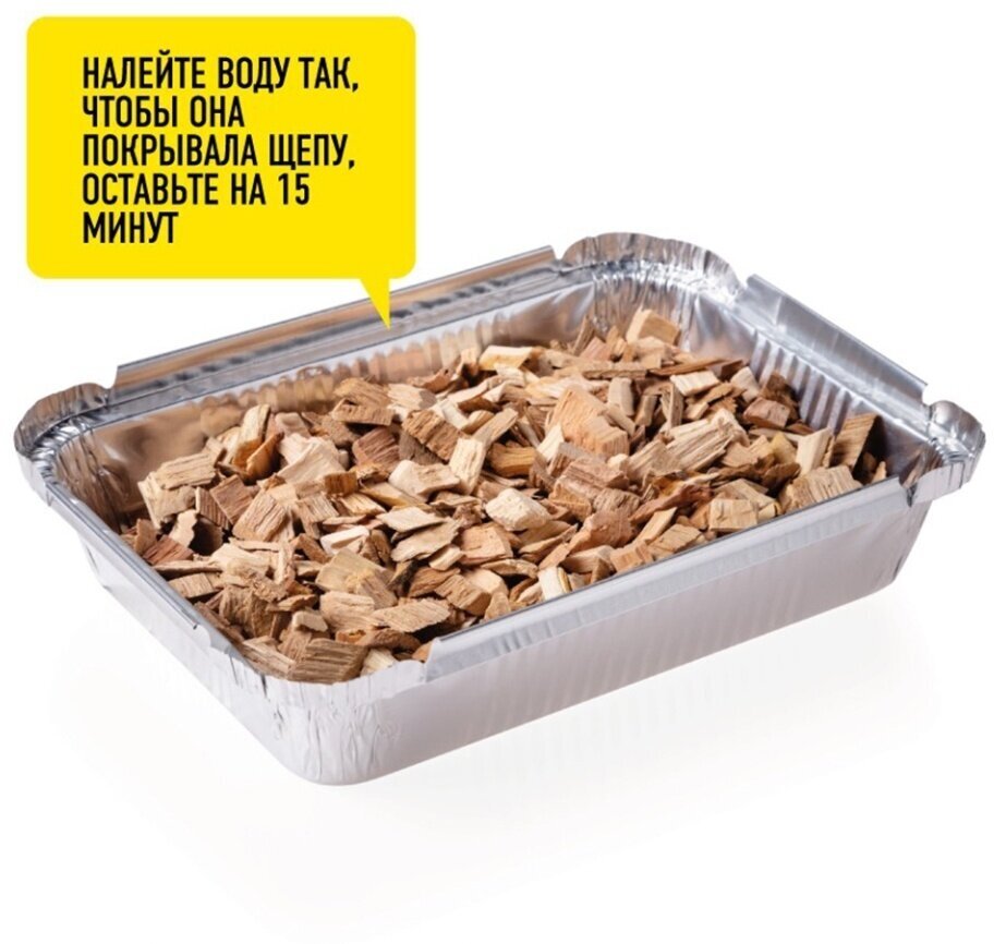 | Способ применения | 1. Снимите картонную обечайку, достаньте целлофановый пакет с щепой из лотка, аккуратно вскройте . 2. Пересыпьте щепу в лоток, налейте в лоток воды так, чтобы она покрыла щепу и оставьте на 15 минут. 3. Слейте воду. 4. Поставьте лоток на тлеющие угли или на специальный лоток для щепы. 5. Далее используйте в зависимости от метода приготовления блюда. |