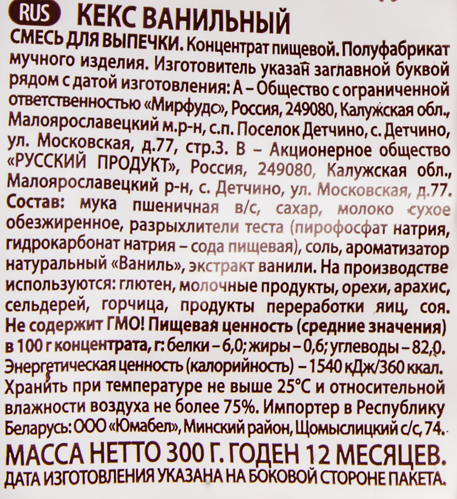 | Состав | Мука пшеничная в/с, сахар, молоко сухое обезжиренное, разрыхлители теста (пирофосфат натрия, гидрокарбонат натрия - сода пищевая), соль, ароматизатор натуральный "Ваниль". |
