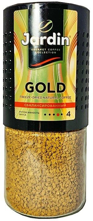 Кофе растворимый Jardin Gold 95 г. Золотой стандарт растворимого кофе: сбалансированный вкус со сладко-сливочным послевкусием. Хранить в защищенном от прямых солнечных лучей месте при температуре не выше 35 °С и относительной влажности воздуха не более 75%.