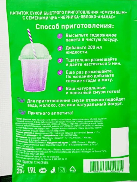 | Состав | Фруктоза, мука из семян чиа, семена чиа черные, яблоко сушеное с кожурой порошок, ананас сублимационной сушки порошок, свекла сушеная порошок, черника сублимационной сушки порошок, мальтодекстрин, загуститель камедь гуаровая, ароматизатор пищевой натуральный лесные ягоды, экстракт бурых морских водорослей. |