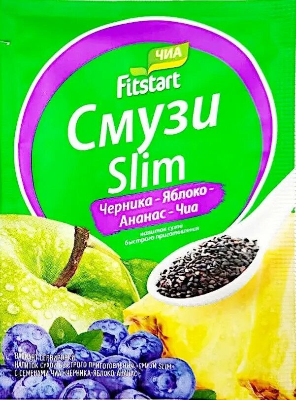 Смузи Slim (Слим) Черника-яблоко-ананас-чиа ТМ Fitstart (Фитстарт) - это напиток сухой быстрого приготовления, который имеет 100% натуральный состав.Смузи создан на основе семян чиа, не содержит искусственных добавок и усилителей вкуса, без сахара и консервантов.Для приготовления смузи отлично подойдет вода, сок, молоко или натуральный йогурт.Вы можете выбрать любимое занятие и при этом получать удовольствие от сбалансированного и полезного питания с Fitstart!