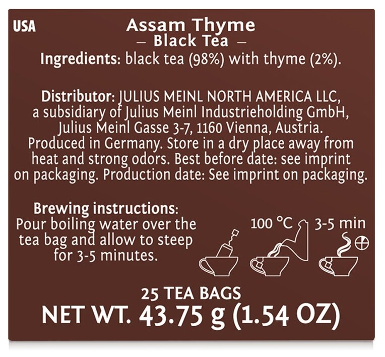 Купаж «Ассам» из лучших сортов индийского черного чая, насыщенный терпкий вкус которого смягчен нежным чабрецом (тимьяном) со слегка сладковатым ароматом — это премиум чай Julius Meinl, создающий венские чайные и кофейные традиции с 1862 года. Напиток заряжает бодростью и оптимизмом, оставляя мягкое послевкусие с легкими солодовыми нотками. Достаточно 3–5 минут, чтобы заварить — и можно наслаждаться.Состав: 100% черный индийский чай Ассам.