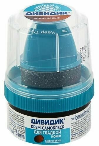 Крем-самоблеск для обуви Дивидик в банке с намазком коричневый, 55 мл. Крем самоблеск для обуви Дивидик защищает от пыли, влаги и соли, ухаживает за обувью, обновляя ее цвет и смягчая кожу.Обеспечивает устойчивый блеск. Губка-аппликатор позволяет равномерно наносить крем, не пачкая рук.Усовершенствованная крышка предотвращает попадание воздуха внутрь упаковки.