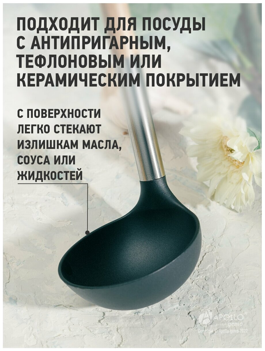 Половник предназначен для перемешивания блюд в процессе варки и подачи готовых блюд. Изделие прекрасно подойдёт для посуды с антипригарным, тефлоновым или керамическим покрытием. Рабочая часть изделия выполнена из пищевого пластика и выдерживает температуру до 260˚.