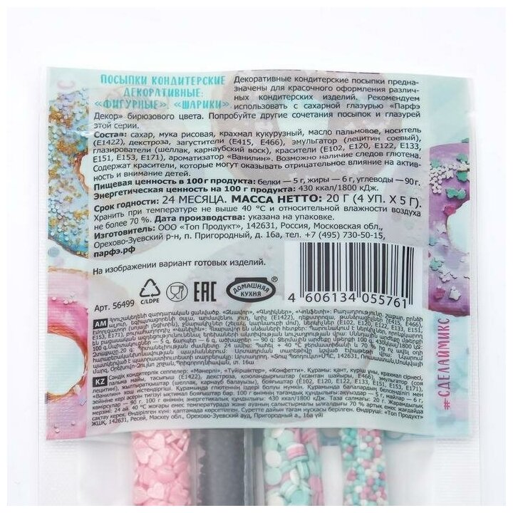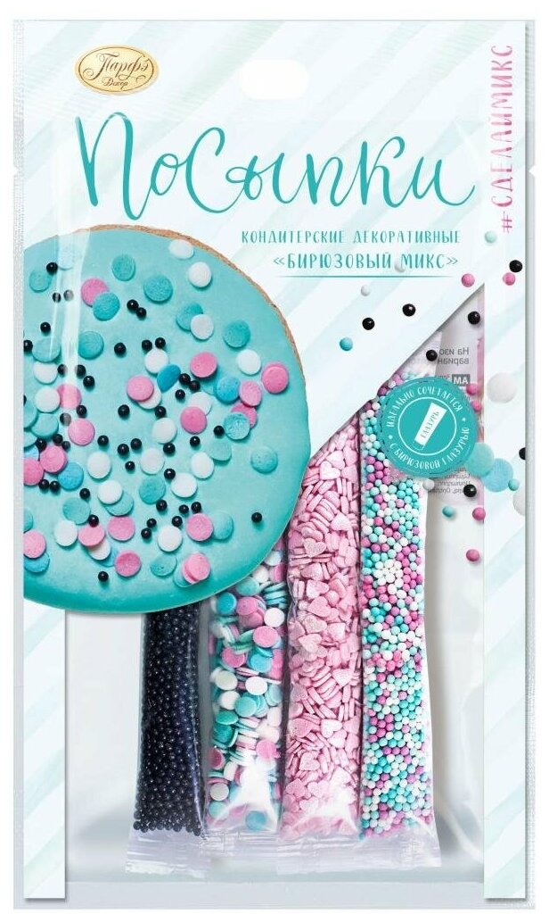 Декоративные кондитерские посыпки предназначены для красочного оформления различных кондитерских изделий. Рекомендуем использовать с сахарной глазурью "Парфэ Декор" бирюзового цвета. Попробуйте другие сочетания посыпок и глазурей этой серии.