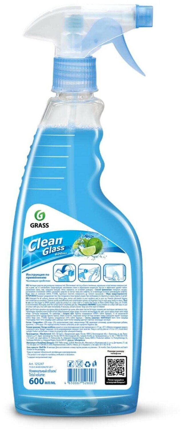 Чистящее средство Grass Clean Glass для стекол и зеркал 600мл Clean Glass, Голубая лагуна, 600 мл