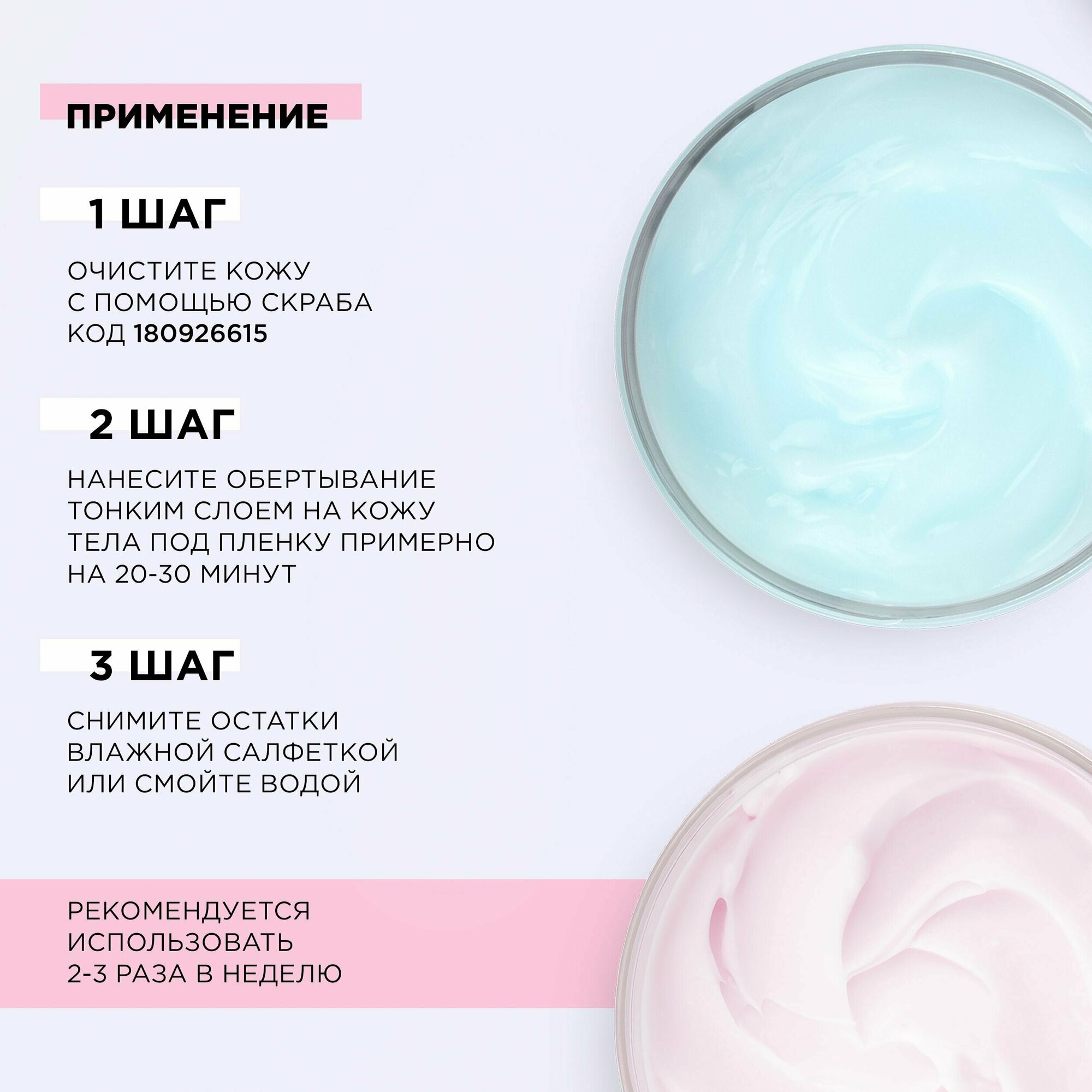 | Способ применения | Нанеси тонким слоем на кожу тела под плёнку примерно на 20 - 30 мин., далее сними остатки влажной салфеткой либо смой водой. Используй 2-4 раза в неделю. |
