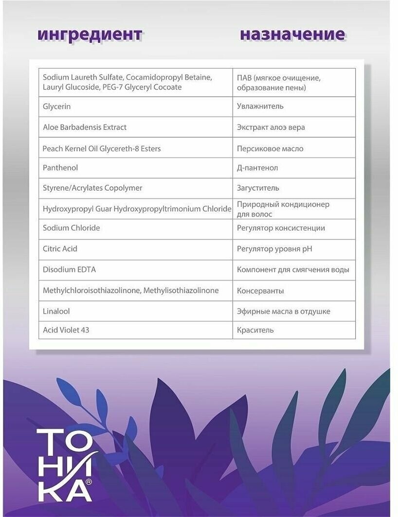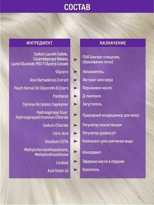 | Состав | Вода специально очищенная (aqua), натрий лаурет сульфат (sodium laureth sulfate), кокамидопропилбетаин (cocamidopropyl betaine), лаурил глюкозид (lauryl glucoside), натрия хлорид (sodium chloride), пэг-7 глицерил кокоат (peg-7 glyceryl cocoate), глицерин (glycerin), экстракт алоэ (aloe barbadensis extract), стерин/акрилат сополимер (styrene/acrylates copolymer), гидроксипропил гуар гидроксипропилтримониум хлорид (hydroxypropyl guar hydroxypropyltrimonium chloride) [1760] оксиэтилированное персиковое масло (peach kernel oil glycereth-8 esters) [1717] д-пантенол (panthenol) [1692] кислота лимонная (citric acid) [1699] соль динатриевая этилендиамин-n-n-n’-n’-тетрауксусной кислоты 2-водная (disodium edta), parfum (fragrance), methylchloroisothiazolinone [5287] methylisothiazolinone, acid violet 43 |