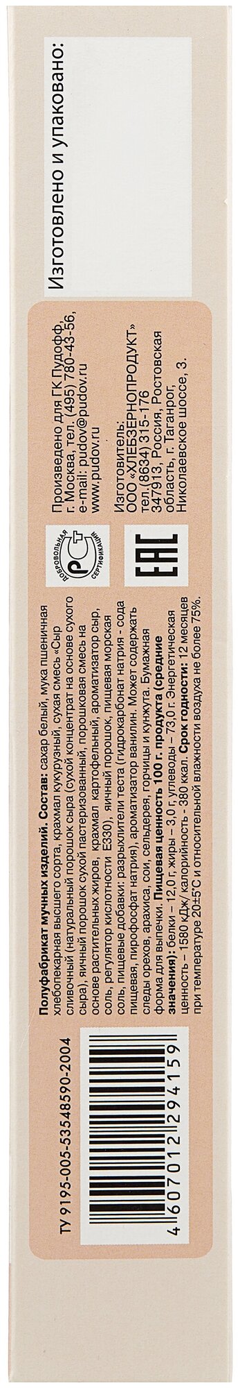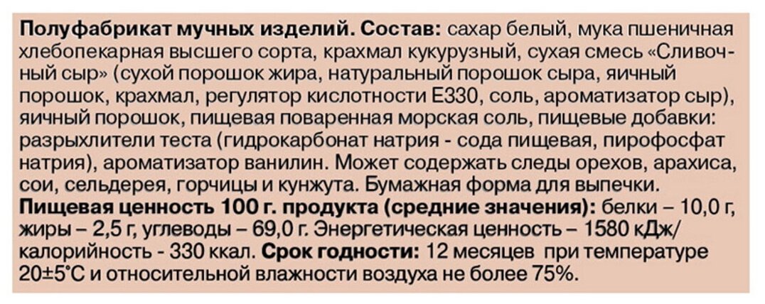 | Состав | сахар-песок, мука пшеничная хлебопекарная высшего сорта, крахмал кукурузный, сухая смесь "Сливочный сыр" (сухой порошок жира, натуральный порошок сыра, яичный порошок, крахмал, регулятор кислотности Е330, соль, ароматизатор сыр), яичный порошок, пищевая поваренная морская соль, пищевые добавки |