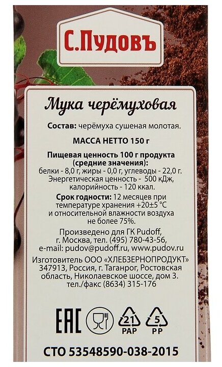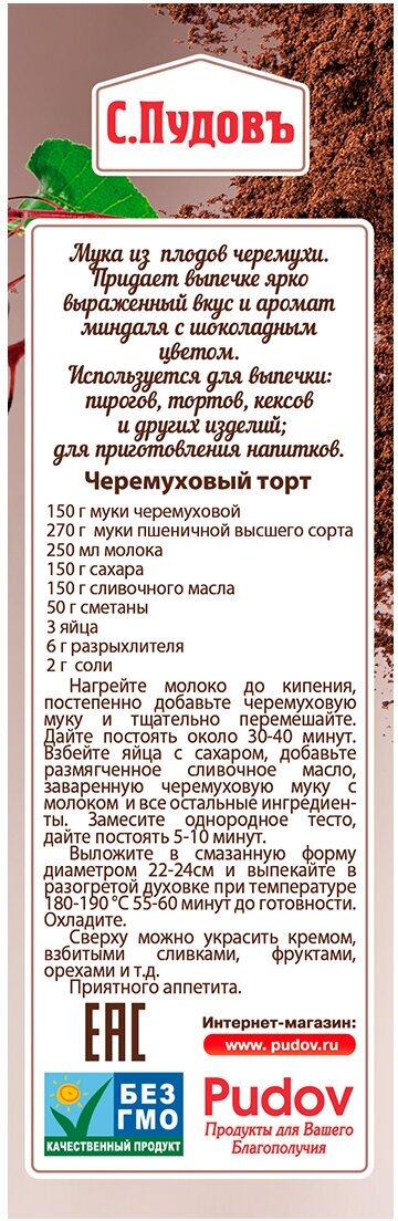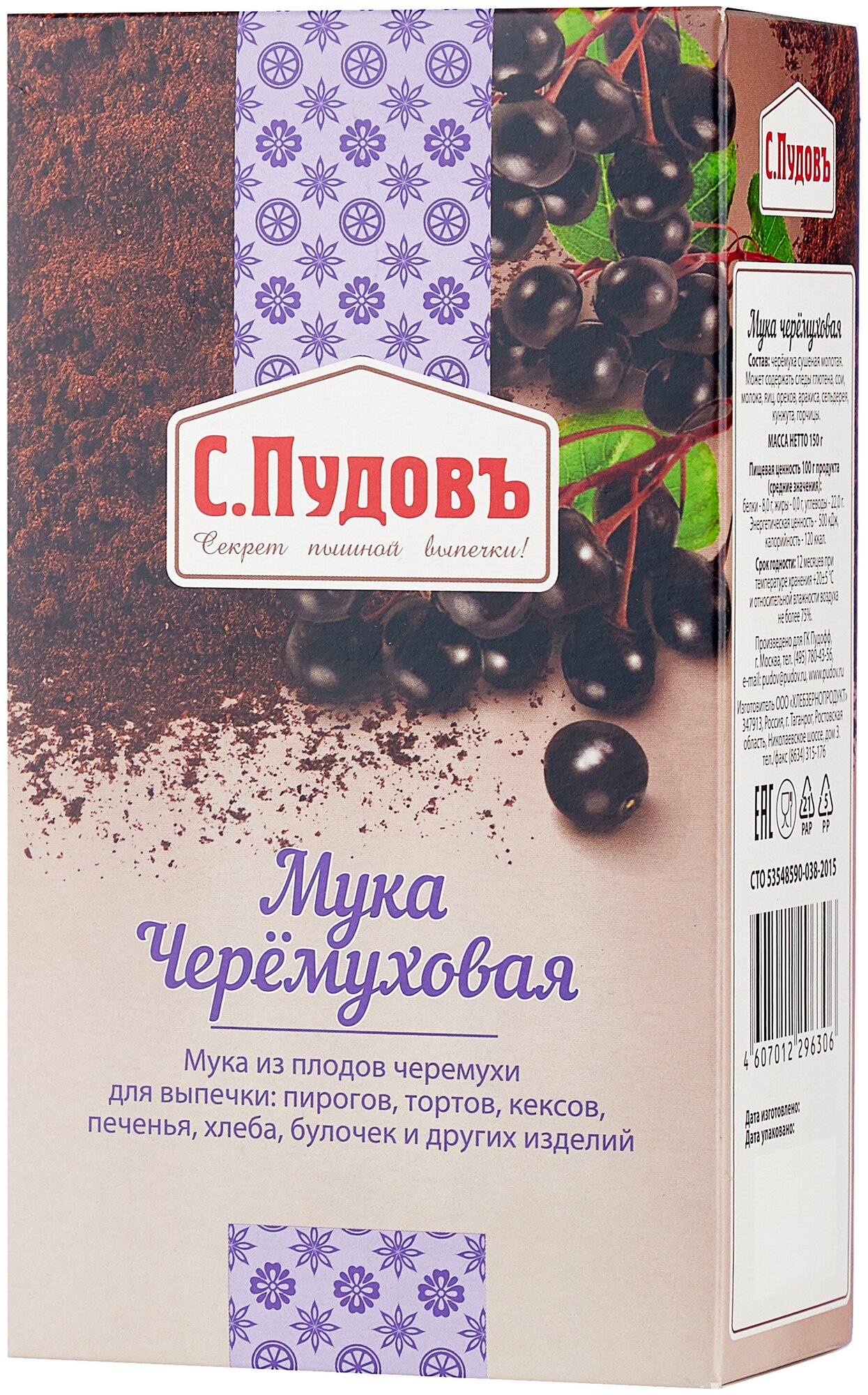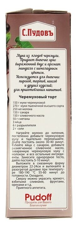Мука черемуховая «С.Пудовъ» - уникальный продукт, сочетающий в себе особенный вкус и большую пользу.Ароматная черемуховая мука придаёт любой выпечке яркое вкусовое сочетание ореха, вишни и шоколада.При этом, чтобы добиться желаемого результата, много черёмуховой муки не нужно.Польза этого продукта обусловлена уникальным набором витаминов, минералов и других микроэлементов.Черемуха – лидер по содержанию кальция, железа и витаминов группы В.При измельчении вся польза ягод переходит в муку.Добавлять черемуховую муку можно в разнообразную выпечку: хлеб, печенье, булочки, кексы, торты и так далее. Кондитерские изделия получаются ароматными, очень вкусными и полезными!Продукт, которым обязательно стоит побаловать близких!