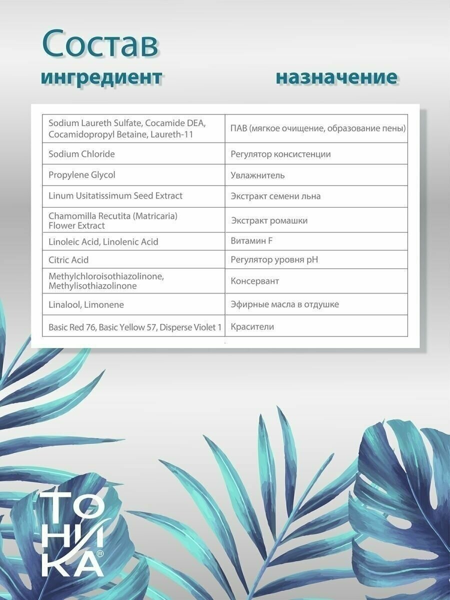 | Состав | Вода специально очищенная, цетеариловый спирт, пропиленгликоль, цетримониум хлорид, цетеарет-23, пэг-40 гидрогенизированное касторовое масло peg-40, льняное масло, кондиционирующий компонент, экстракт семени льна, витамин f, кондиционирующий компонент, кислота лимонная, отдушка, метилхлороизотиазолинон e, метилизотиазолинон p, компонент отдушки, компонент отдушки, краситель |