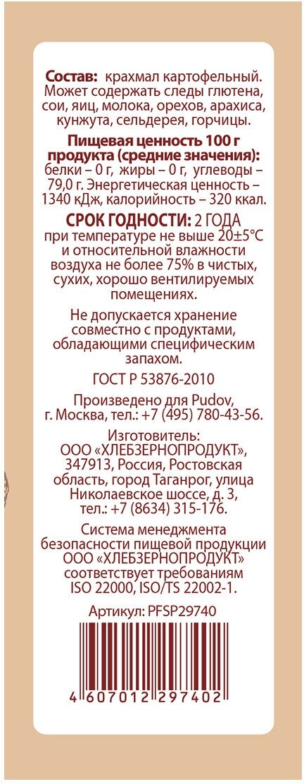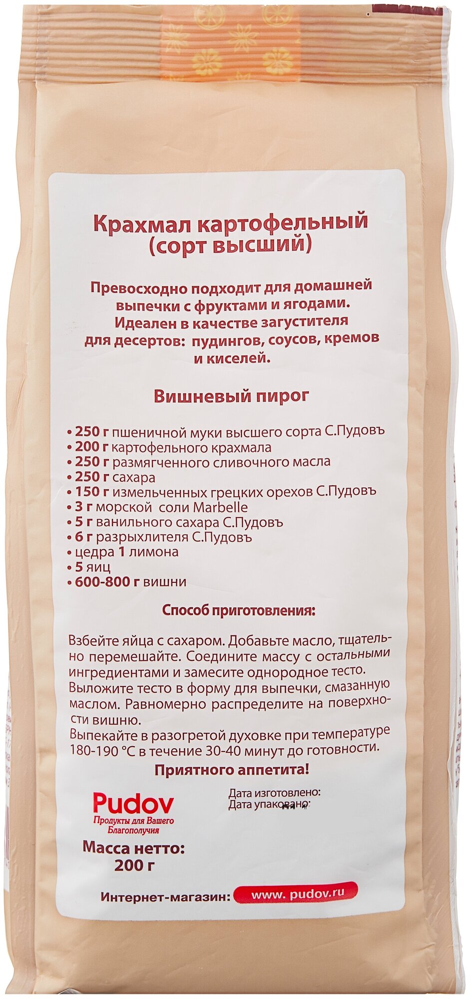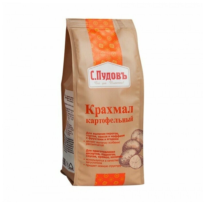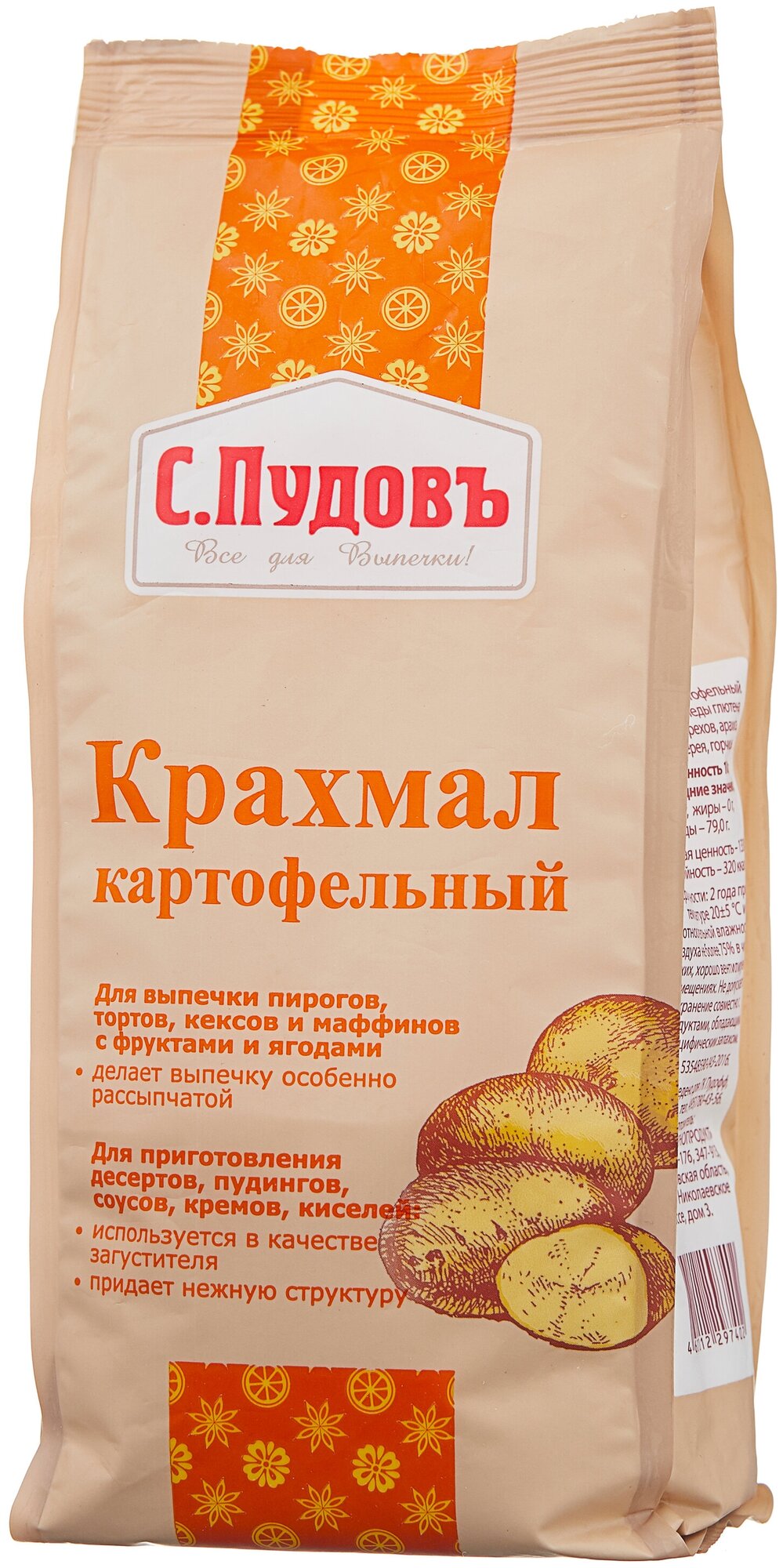 Картофельный крахмал высшего сорта «С. Пудовъ» создан специально для домашних и профессиональных кулинаров. Это натуральный загуститель, который подходит для повседневных, диетических блюд, а также используется в выпечке.Картофельный крахмал используется в выпечке, при приготовлении супов, вторых блюд, десертов, напитков. Соусы, которые легко загущаются при помощи картофельного крахмала, становятся прозрачными и глянцевыми, у них более нежный вкус.Картофельный крахмал широко используется в кондитерском деле. Пироги, торты, кексы и маффины с фруктами и ягодами становятся рассыпчатыми. Сладкие напитки, кремы и пудинги приобретают за счет картофельного крахмала нежную текстуру. Незаменим этот ингредиент при варке киселей.В отличие от кукурузного крахмала картофельный делает жидкость густой при невысоких температурах. Лучше всего картофельный крахмал добавлять в блюда в конце приготовления. Наш крахмал производится очень бережно, поэтому в нём сохраняются полезные микроэлементы – кальций и фосфор. Используйте его на здоровье!Состав: крахмал картофельный. Может содержать следы глютена, сои, яиц, молока, орехов, арахиса, кунжута, сельдерея, горчицы.Пищевая ценность 100 г продукта (средние значения): белки – 0 г, жиры – 0 г, углеводы – 79,0 г. Энергетическая ценность/калорийность – 1330 кДж / 320 ккал.Срок годности: 24 месяца. Хранить при температуре 20±5 °С и относительной влажности воздуха не более 75% в чистых, сухих, хорошо вентилируемых помещениях.Не допускается хранение совместно с продуктами, обладающими специфическим запахом.